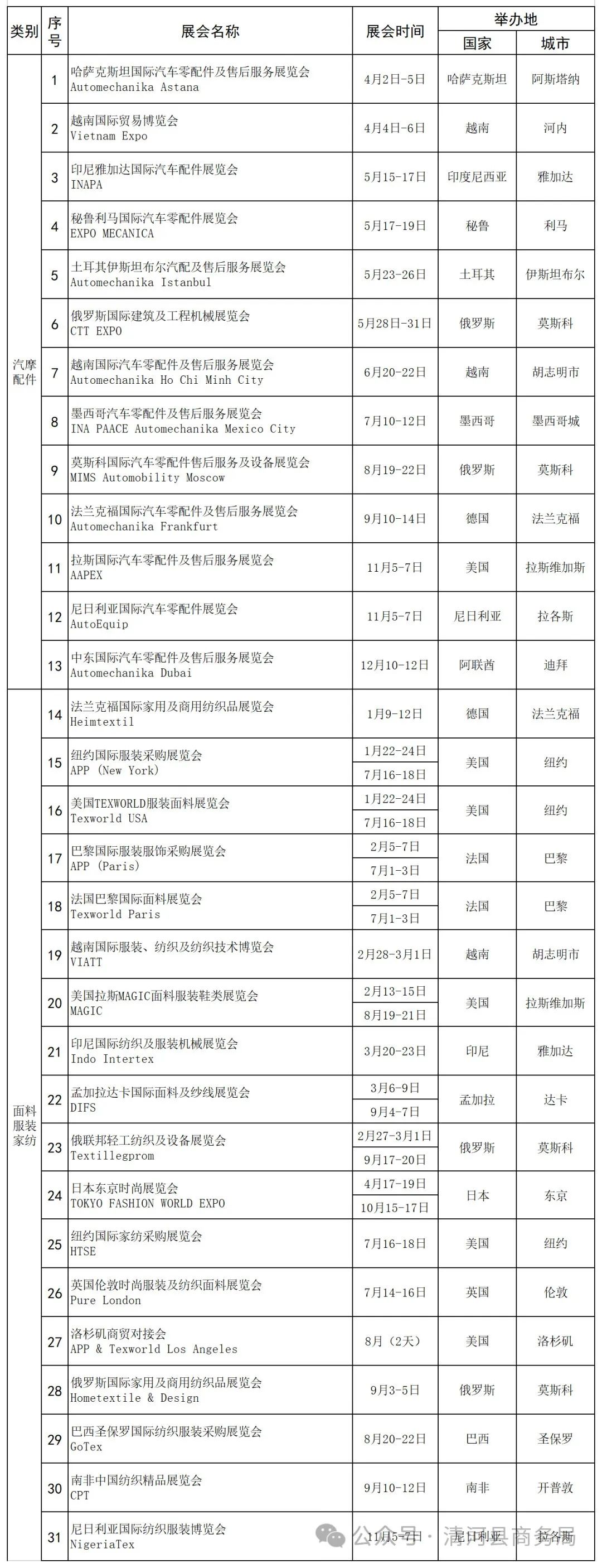为支持我县外贸企业开拓国际市场,推动外贸进出口持续健康发展,县商务局认真筛选出2024年度与我县羊绒、汽配等产业高度关联的境外展会推荐名单,现公布如下: