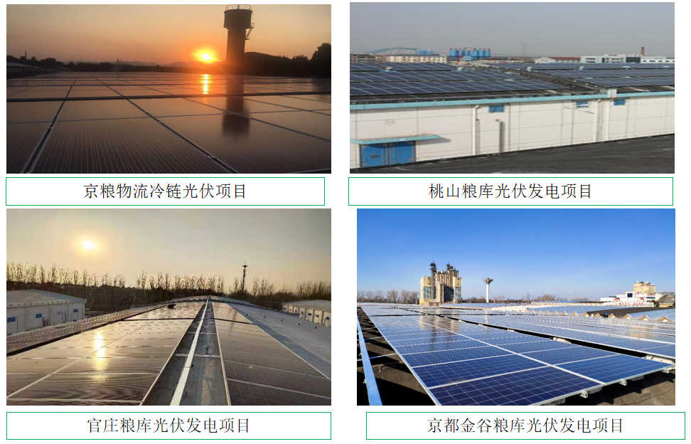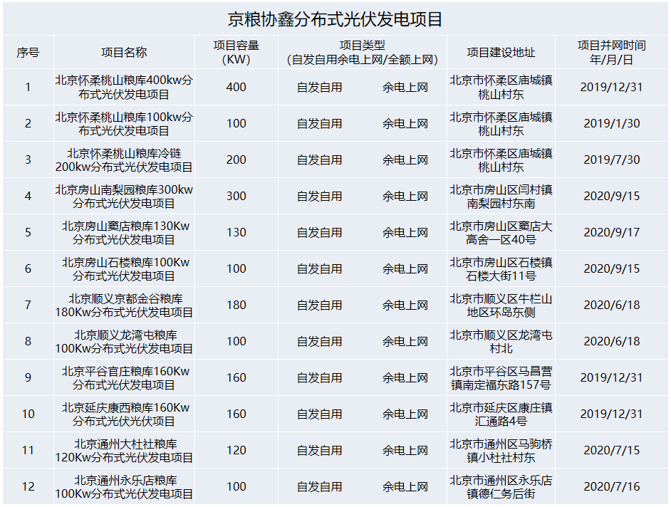 京粮协鑫立足首农食品集团产业发展绿色能源需求,坚持副业反哺主业方针,结合集团主业业态,配套绿色能源,探索“光伏+冷链”“光伏+粮库”“光伏+工厂”“光伏+种/养植”等“光伏+”模式,积极发展光伏发电新能源业务,与首农现有产业融合形成产业+光伏,实现绿色仓储、绿色冷链、绿色工厂、绿色食品。作为首农食品集团内唯一专业的新能源公司,公司积极配合首农食品集团完成北京市国资委下达的“双碳”任务及北京市发改委下达的可再生能源替代工作。公司与各子集团紧密合作,协助相关单位完成可再生能源替代工作,待建及储备了首农畜牧、应急保障中心、篮丰五色土市场、东风德必、硕春冷库、二商肉食等一批优质项目。目前京粮协鑫目前投建项目共计12个,涉及区域包含通州、顺义、平谷、怀柔、延庆、房山、丰台等7个区县的粮库及冷库。