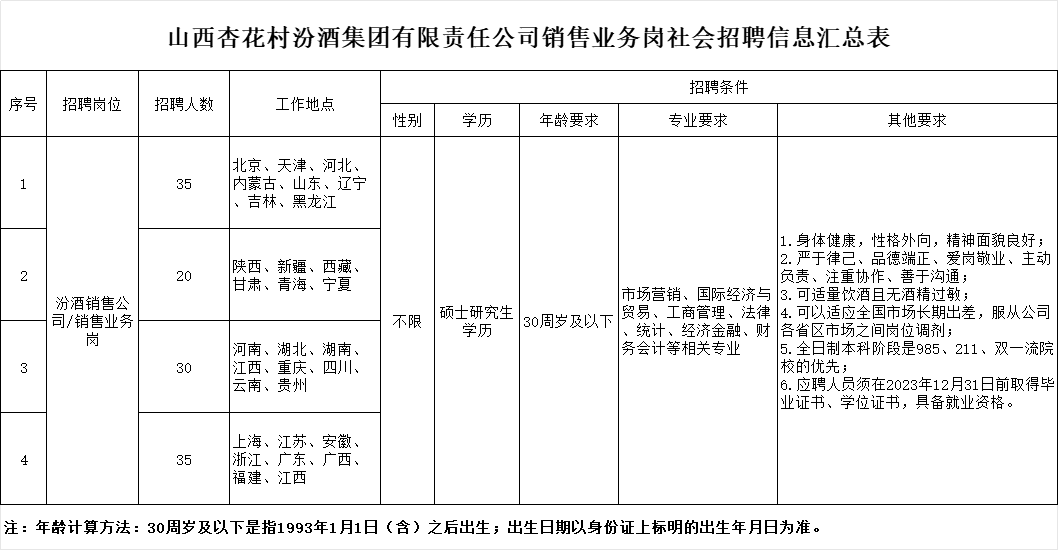 山西杏花村汾酒集团有限责任公司成立于2002年3月,是在原山西杏花村汾酒(集团)公司基础上改制成立的国有全资公司,是以生产销售汾酒、竹叶青酒和杏花村酒为主,集白酒、大健康产业、文化旅游于一体的省管重要骨干企业,是国家工信部认定的“全国工业品牌培育示范企业”、国务院国资委“国企改革双百行动”入选企业。汾酒集团清香型白酒生产基地共11000余亩,全部集中在世界十大烈酒产区——山西吕梁产区;原粮种植基地130余万亩,分布在山西、东北、内蒙古、甘肃、河北等地。产品覆盖全国34个省、市、自治区、特别行政区以及美国、英国、澳大利亚、日本等全球50多个国家和地区,终端销售网点超过112万家。为继续做好营销人才支撑、储备工作,延续汾酒营销事业稳中有进、持续向好的发展态势,结合营销人员急需紧缺程度,现开展面向社会公开招聘销售业务人员120名。具体内容如下:面向社会公开招聘岗位为山西省外区域市场销售业务岗位,招聘人数为120人。招聘详细条件见附件《山西杏花村汾酒集团有限责任公司销售业务岗社会招聘信息汇总表》。1.遵章守法、严于律己,有强烈的事业心、责任心,具有团队合作精神;2.品德端正、爱岗敬业、主动负责、注重协作、服从安排;3.具备与岗位匹配的学历、工作能力、专业技术、技能和专业知识;4.身体健康,无传染病、皮肤病、癫痫病、精神病等疾病,符合食品行业的健康要求;1.受过党纪处分、违反治安处罚条例(含被拘留的)或者现处于处分期或影响期内的;2.曾因犯罪受过刑事处罚或涉嫌违纪违法尚未作出结论的;3.在此前集团公司及其子分公司公开招聘或国家组织的各级各类招考中被认定为扰乱报名考试秩序、威胁工作人员人身安全和舞弊行为的;本次招聘按照招聘信息发布--报名--资格审查--综合测试--确定人选--背景调查和体检--公示--录用程序进行。本次招聘信息在山西省国有资本运营有限公司(http://www.ssco.ltd/)发布招聘公告。本次招聘统一采用网上报名的方式,不接受其他形式报名,每位应聘者根据意向工作地点选择填报并只可选择一个工作区域。报名人员要如实提交有关信息和材料,报名提交成功后,所有信息不能修改。凡因本人填写信息错误而导致的一切后果自行负责,如有弄虚作假行为,一经查实即取消报名资格。报名入口:https://fenjiu2024xs.zhaopin.com(报名时请使用电脑)聘请专业机构对应聘人员进行资格审查,通过人员将参加统一组织的考试。以短信方式通知应聘人员后续事宜,未接到通知的,即视为未通过资格审查,不再另行通知。资格审查将贯穿整个招考环节,如发现不符合应聘资格条件、弄虚作假或故意隐瞒真实情况者,将随时取消考试及聘用资格。综合测试采取笔试+面试方式。根据资格审查结果,以短信方式通知进入笔试或面试环节的人员,具体时间、地点、要求以短信通知为准。未进入笔试或面试环节的人员不再另行通知。笔试成绩和面试成绩均按百分制计算,按权重成绩相加作为考试总成绩:依据总成绩排序,确定招聘拟通过人选,并以短信方式通知参加背景调查和体检,未录用人员不再另行通知。1.聘请专业机构对拟录用人员的身份信息、教育信息、信用风险、商业利益冲突等进行背景调查。背景调查不符合要求的,不予录用;2.要求应聘者到专业检测机构进行健康体检,体检费用由应聘者自理;3.背景调查或体检过程中有不符合要求的,取消其聘用资格,将减少或取消招聘岗位。在最终成绩基础上,结合背景调查和体检情况,确定拟录用名单,并在山西省国有资本运营有限公司网站进行公示,公示期为5个工作日,公示期满无异议,按规定办理录用手续。公示期间及期满后拟聘用人员主动放弃岗位或被反映有问题并查有实据影响录用的,取消聘用资格,所空名额不再递补。公示期满无异议的,为录用者办理入职手续,并与公司签订三年期劳动合同。(一)应聘人员的手机号码务必填写准确,确保通信正常。因报考者手机号码错误或因通信不畅导致本人未能按要求参加笔试、面试、背景调查、体检、录用的,责任自负;(二)在招聘实施过程中,报考者因各种原因未能参加招聘环节考核的,视为自动放弃应聘资格;(三)持海外院校学历、学位证书的,需附教育部留学生服务中心认证的国外学历学位认证书;(四)应聘人员提交的材料,我公司会严格保密,不作他用;(五)本次招聘不提供任何考试参考资料或举办培训班,请各位应聘人员注意,切勿上当受骗;(六)对未在规定时间内报到的人员,取消其聘用资格;(七)公司对录用人员实行试用期考核,经试用期考核不合格者公司依法与其解除劳动合同;咨询时间:工作日9:00-12:00/14:00-18:00附件:山西杏花村汾酒集团有限责任公司销售业务岗社会招聘信息汇总表