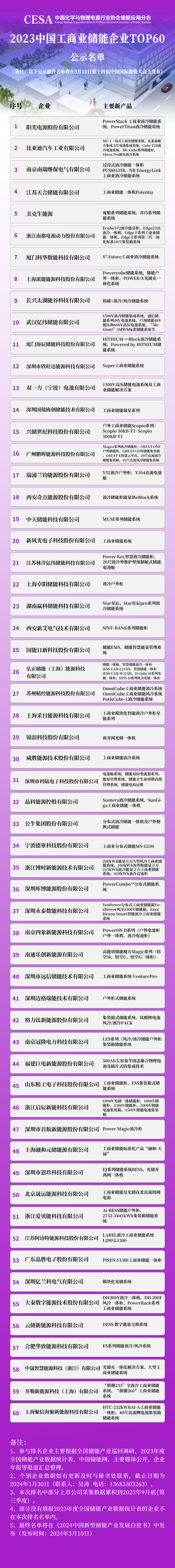本次储能产业链百强企业评选活动针对的对象主要是 CESA 储能应用分会广大会员企业和与储能业务紧密相关的上市公司,评价数据以2023年为准,主要通过协会实地走访调研、会员企业年度数据申报、媒体披露和上市公司年报等多个渠道,最终形成2023中国新型储能锂离子电池企业TOP20、2023中国新型储能系统集成企业TOP30、2023中国新型储能PCS企业TOP30、2023中国新型储能液流电池企业TOP30、2023中国工商业储能企业TOP60、2023中国新型储能BMS企业TOP10、2023中国新型储能飞轮储能企业TOP10、2023中国新型储能温控系统企业TOP20、2023中国新型储能消防与安全企业TOP 20、2023中国新型储能压缩空气储能企业TOP10及2023中国新型储能产业企业TOP100名单。