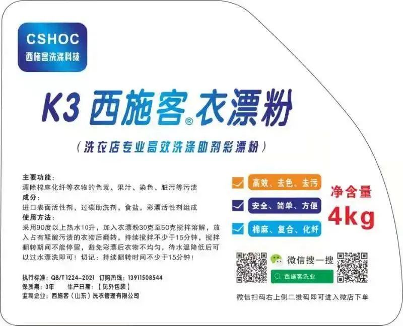 主要解决水洗衣物沾上的色素污渍去除。适用于棉、麻、化纤等面料上果汁、红酒、饮料、果汁等植物色素污渍。对于床上脏污严重的洗涤时加入30克,也有较强的增亮增鲜效果,尤其是夏天体恤衫、衬衫、休闲裤等衣物洒上果汁后,使用K3衣漂净去除立竿见影。