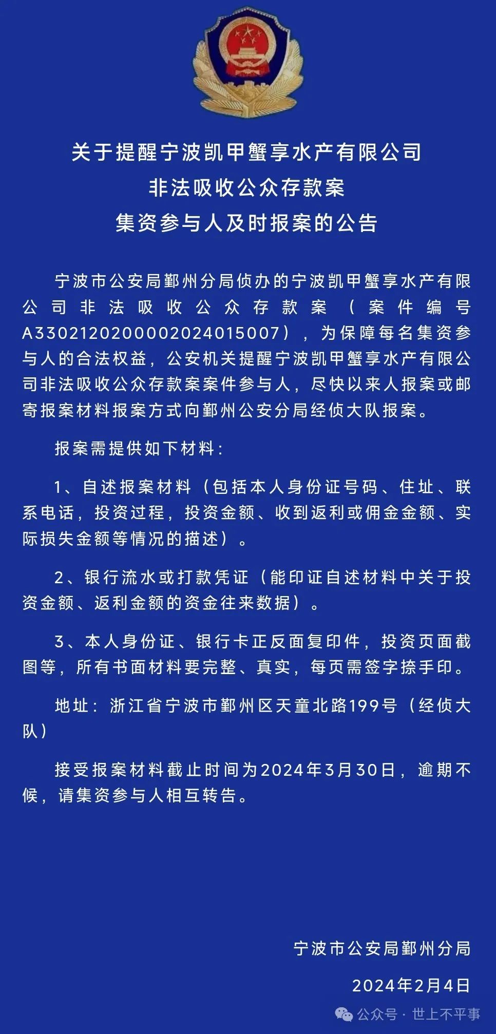 2024年2月4日,宁波市公安局鄞州分局对外发布了关于提醒宁波凯甲蟹享水产有限公司非法吸收公众存款案集资参与人及时报案的公告。