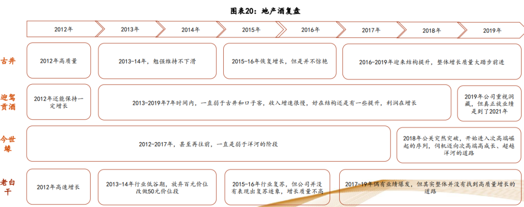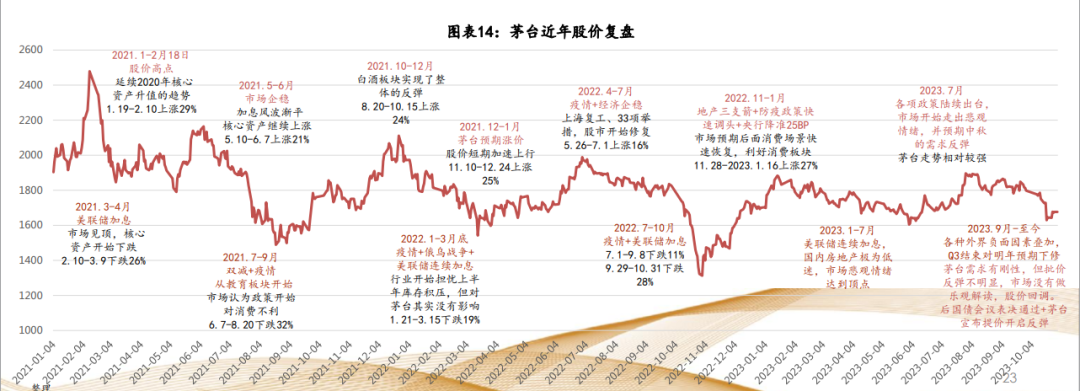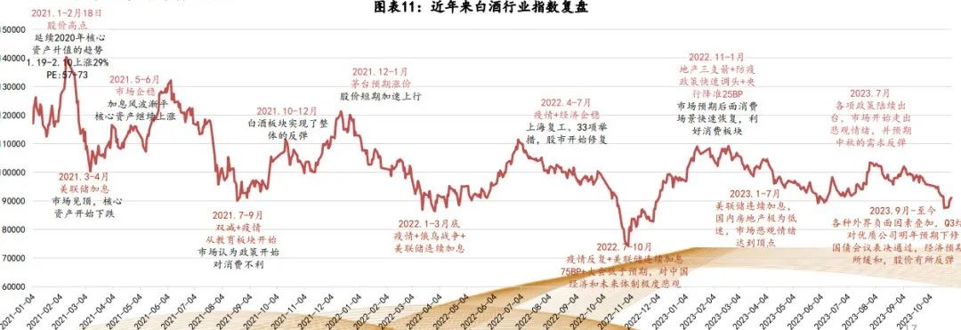 2023年,对于白酒行业来说是一个特殊的一年,有很多的关键词:有经济太差带来的需求减弱,有库存增加带来的销货压力,也有消费降级带来的“奢侈品”寒潮。但无论原因怎么变,结果不会变,那就是受基本面影响,最近八年来,白酒的股价进入“估值、业绩”双杀阶段。回顾2023年,需求疲软、结构分化、股价波动巨大,是白酒行业的真实写照。结合价位段和消费场景来看,上半年疫情复苏后,需求端阶段性有惯性,但是进入5月份,需求端的悲观情绪快速蔓延;10月份的经济刺激也没有真正能够拉动需求,整体较为疲软,核心原因是政商务消费场景的萎缩。1、政商务场景(次高端及以上):明显经济活跃度降低,政商务消费场景减少(地产是大头,上下游都有影响,还有医疗、教育、 金融等);2、宴席场景:宴席端仍然保持较高需求,而且结构持续向上;3、大众消费(300元以下):整体上市场反馈有降级趋势,但局部区域仍然保持升级,比如安徽、江苏。各价位段都呈现出明显的“龙头效应”,非龙头品牌承压明显。1、高端:茅台需求仍然刚性,五粮液预计全年动销仍然维持正增长;2、次高端:除了汾酒和剑南春,舍得、水井、酒鬼2023年都遇到了成长期一定的瓶颈,这些公司一致问题都是在走完前期低基数、高增长以后,再次延续高增长受阻,相对稳步增长的路径和节奏也被间断打断;其中来看酒鬼率先调整,可以考虑是否关注;3、地产酒:古井、迎驾、今世缘、金徽四家公司表现较好,其他要么高基数要么竞争压力大;背后核心是这些公司占比较高的主力市场抓住了政商务关系;没有政商务抓手的公司,会陷入与一堆外来品牌渠道苦战的状态,自然增长乏力。成长股思维开始无效,龙头公司短期也面临压力,弱公司容易被轻信,行业机会是结构性的。1、次高端,成长股思维开始无效:受益于2021年次高端的高成长,市场存在部分投资者对次高端公司的高成长有一些过度解读;这导致在公司出现经营状态异常的情况下,市场对变化反应迟钝,一方面是报表端数据仍然有支撑,另一方面是部分资金惯性思维/博弈预期较强;而在此过程中股价就会非常有迷惑性;酒鬼、水井坊、舍得都是如此;而事实是这些次高端品牌在过了前期低基数的高成长以后,持续成长的势能积聚慢于真实业绩增长程度, 因此在经济弱化较快下遇到了瓶颈;2、大白马,龙头公司也承压:在政商务需求整体收缩的背景下,客观来讲茅五需求也承压;3、二三线增速相对较慢公司易被预期左右:今年市场部分短期资金参与口子窖、老白干、顺鑫农业、水井坊和伊力特投资时,更多从预期角度进行投资决策而非当期事实;研究员如果不能够对公司的真实短期情况进行识别,并考虑到板块贝塔,把假设大于事实,则短期股价充满博弈,收益将压力较大(中长期除外);珍酒李渡亦是如此, 短期要充分考虑贝塔和基本面;4、看质地,机会是结构性的:2023年基本面与股价偏离相对较小的,除了茅台,有迎驾贡酒、今世缘和山西汾酒等公司;这几家公司在行业逆势下仍然实现了较为扎实的增长,使得结构性股价投资机会比较突出。复盘白酒行业指数,我们发现由于板块市值体量除了与板块基本面外,与宏观经济关联紧密,尤其是国内房地产行情、国内经济增长预期、海外经济周期、国内各项政策等。