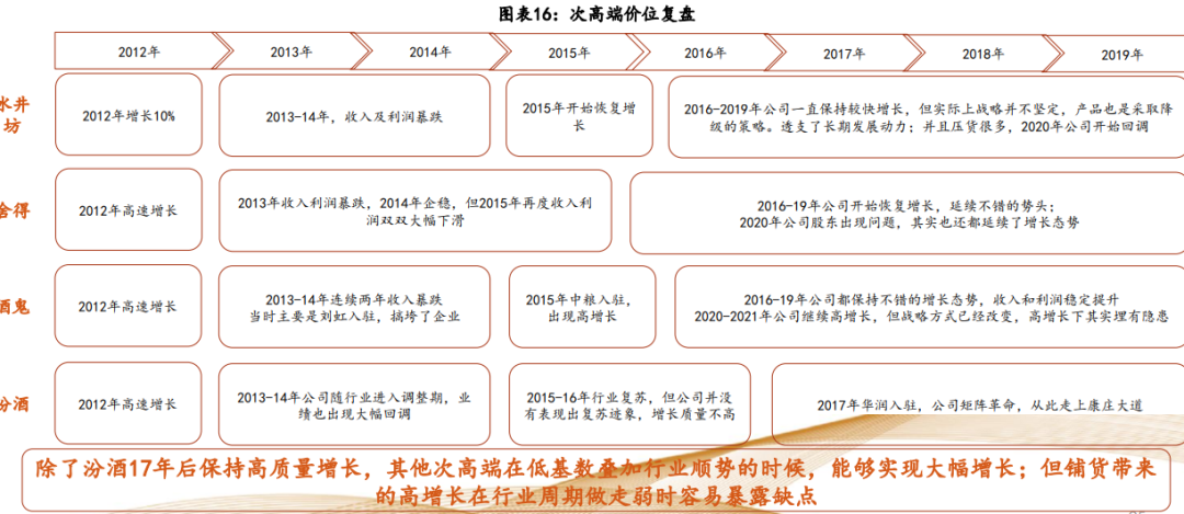 茅台:先抑后扬,五粮液虽然也高光时刻,但因为量价节奏问题,整体上表现落后于茅台。茅台作为行业当之无愧的绝对龙头,量价控制能力和商业模式都是行业顶尖的,随着收入规模突破千亿元,市场对公司长期预期为龙头品牌势能和结构提升/提价预期下,年化收入业绩双位数增长。千亿体量下整体基本面非常稳定,股价走势与行业指数基本相同,更多反映市场对行业整体和宏观经济的预期。五粮液:价值类代表性标的,反映市场对需求的预期 。五粮液作为千元价格带龙头企业,主要优势在于品牌护城河深厚,与茅台不同,大单品普五处在千元价格带主要消费场景为政商务或高端宴席,更贴近企事业单位或个人的实际使用需求。五粮液千亿体量下作为价值类代表性标的,股价走势与行业指数也基本相同,但更多反映市场对行业实际消费需求的预期,因此受行业需求萎靡的影响股价表现相对低于行业指数。周期性较强+整体基数低,所以容易出现暴涨暴跌;唯有汾酒不断跃迁,从弱势地产酒到高质量全国化。2013年是分水岭的一年,构建能力、结构升 级、高质量增长的企业才能支撑长期发展。高端价位:茅五历史上一直比较稳定,业绩波动不大 。次高端:一线名酒+地产龙头持续性更强,二线名酒+弱势地产酒在行业下行周期自身能力较弱的问题暴露出来 。全国二线名酒次高端:历史上低基数的时候曾实现较高增长,但是回调幅度也很大;从当下这个位置看,除了汾酒一往无前,其他次高端历史波动较大;背后根本是品牌底蕴和品牌能力 。地产酒的次高端:差异比较明显,有系统能力的公司,如古井、今世缘、迎驾贡酒等次高端的成长都很好;而经营出现问题、缺乏系统能力、丢掉战略的公司,次高端都出现较大问题 。大众价位:早年是行业主流价位全行业繁荣,当前存量时代,渠道利润替换、竞争轮动逻辑 。早年:大众价位的特点是行业主流价位,以地产酒为代表,全面推动100元价位段的做大做强 。当前:行业呈现的特点是竞争轮动,典型的就是继洋河海之蓝后,各种地产酒都出品了100元价位段的高利润产品,抢夺存量。春节将至,节日气氛在白酒行业变得愈发浓厚,整个行业又将迎来消费旺季,各个品牌也开启了春节营销大战,围绕着不同的媒介、渠道、终端等方面,开启了对消费者资源的争夺,进而扩大市场份额。相信在如此热烈的氛围下,白酒板块或迎来一波不错的行情。观点来源:《白酒行业2024年投资策略:行稳致远,结构机会时代到来》华西证券 2024/01/17 分析师:寇星 S1120520040004)