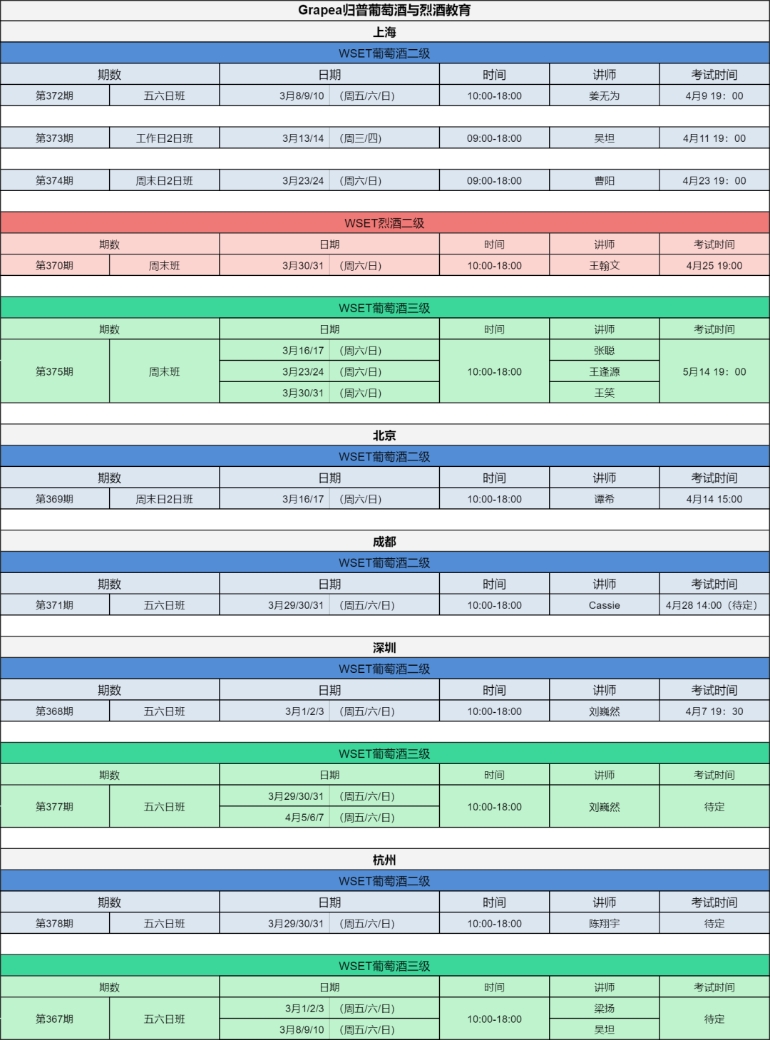 在现有的讲师队伍中,WSET四级拥有者已超过15人,涵盖具备多个国家的产区特长的行业精英,其中包括法国、意大利、德国、奥地利、澳大利亚、新西兰、美国、阿根廷、智利、南非等,师资力量领跑全国。