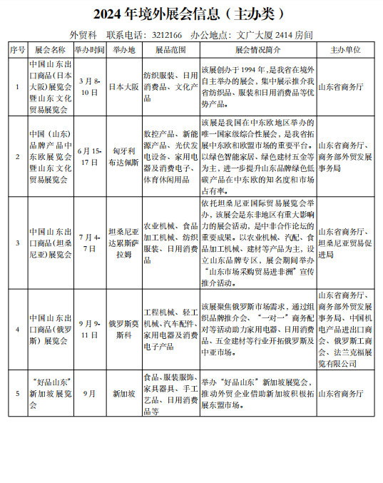 为指导企业精准拓市场抓订单稳份额,引导企业开拓多元化国际市场,推动优化出口商品结构和国际市场布局,结合我省进出口实际和重点市场情况,山东省商务厅制定了2024年“好品山东 鲁贸全球”市场开拓境外展会计划,结合工作实际,展会信息将分11期推送。今天为大家带来第1期——《主办类展会信息》。
