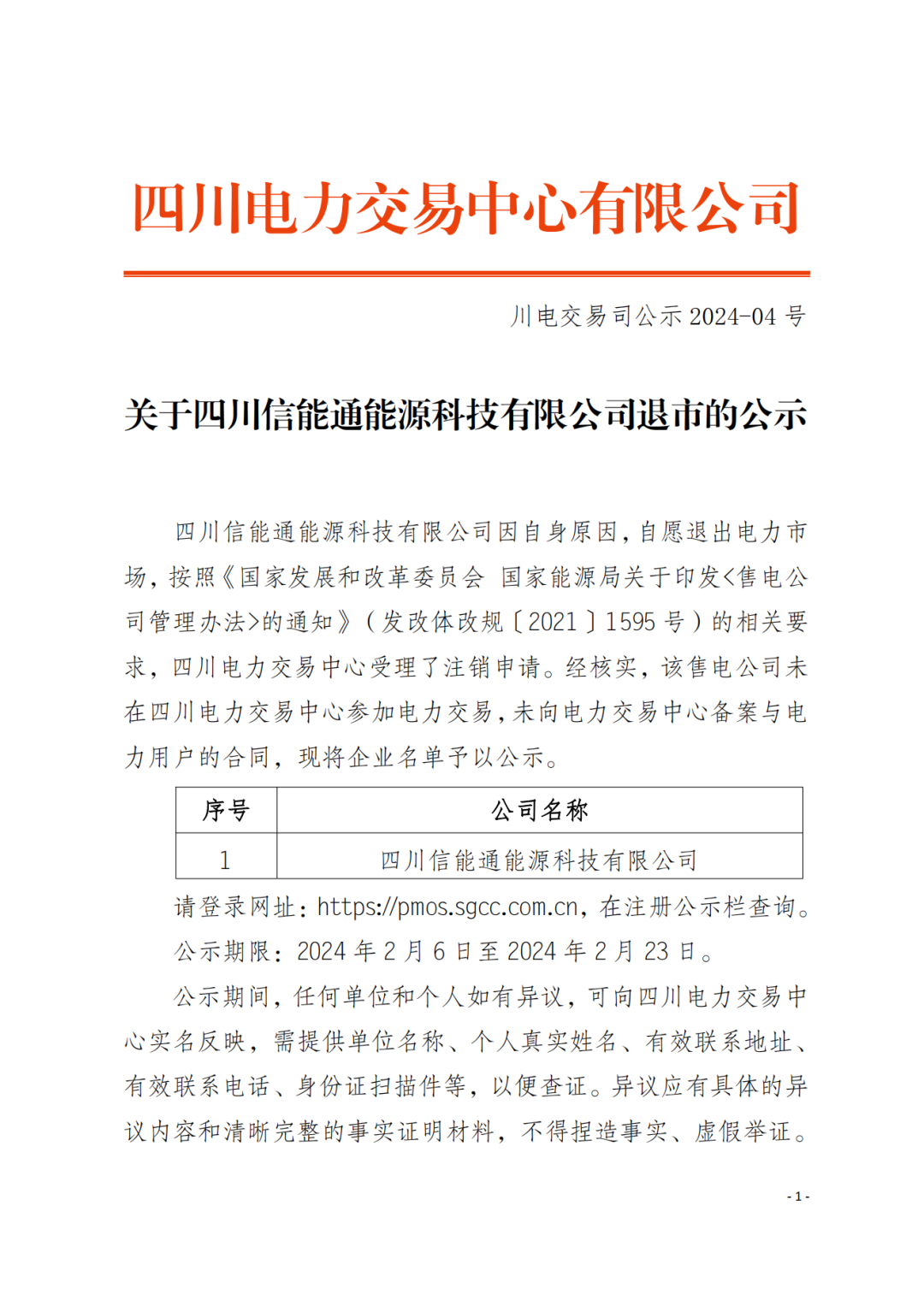 2月6日,四川电力交易中心发布《关于四川信能通能源科技有限公司退市的公示》。详情如下: