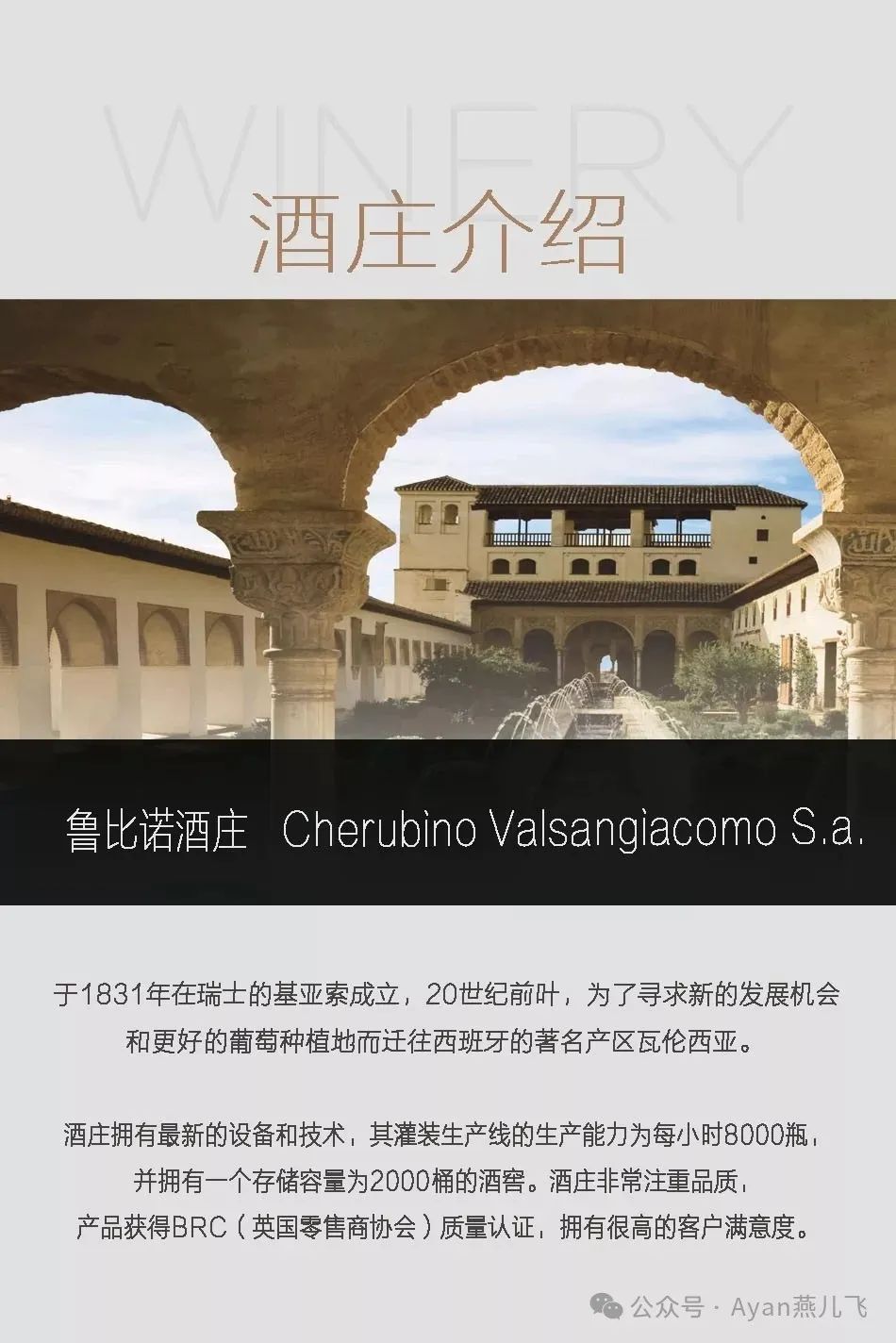Cherubino Valsangiacomo S.a.酒庄于1831年在瑞士的基亚索成立,20世纪前叶,为了寻求新的发展机会和更好的葡萄种植地而迁往西班牙的著名产区瓦伦西亚。