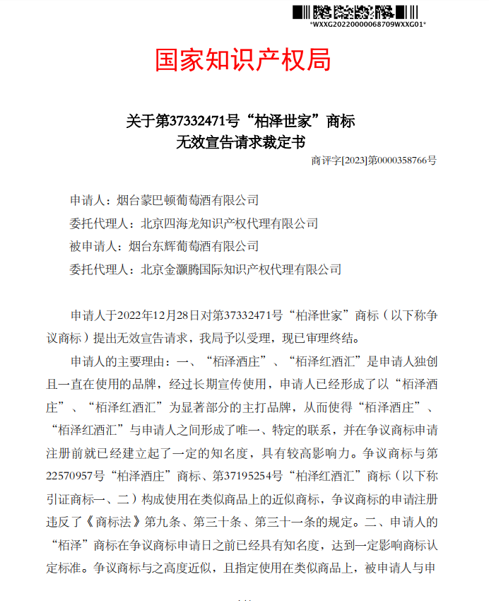由于我司律师对商标进行了细致地分析,条理清楚、有理有据,商标局最终裁定37332471号“柏泽世家”商标予以无效宣告。
