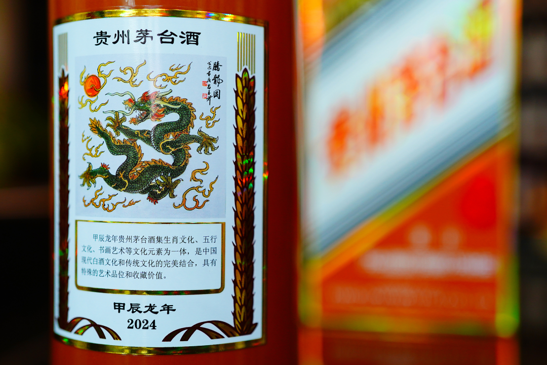 比如,今年的龙茅,其包装龙元素来自国家一级美术师苗再新创作的《腾龙图》,瓶身的酒铭镌刻来自书法家胡抗美,两位国手名家的作品在收藏品市场都价值不菲,他们的创作赋予了龙茅更高的文化价值。
