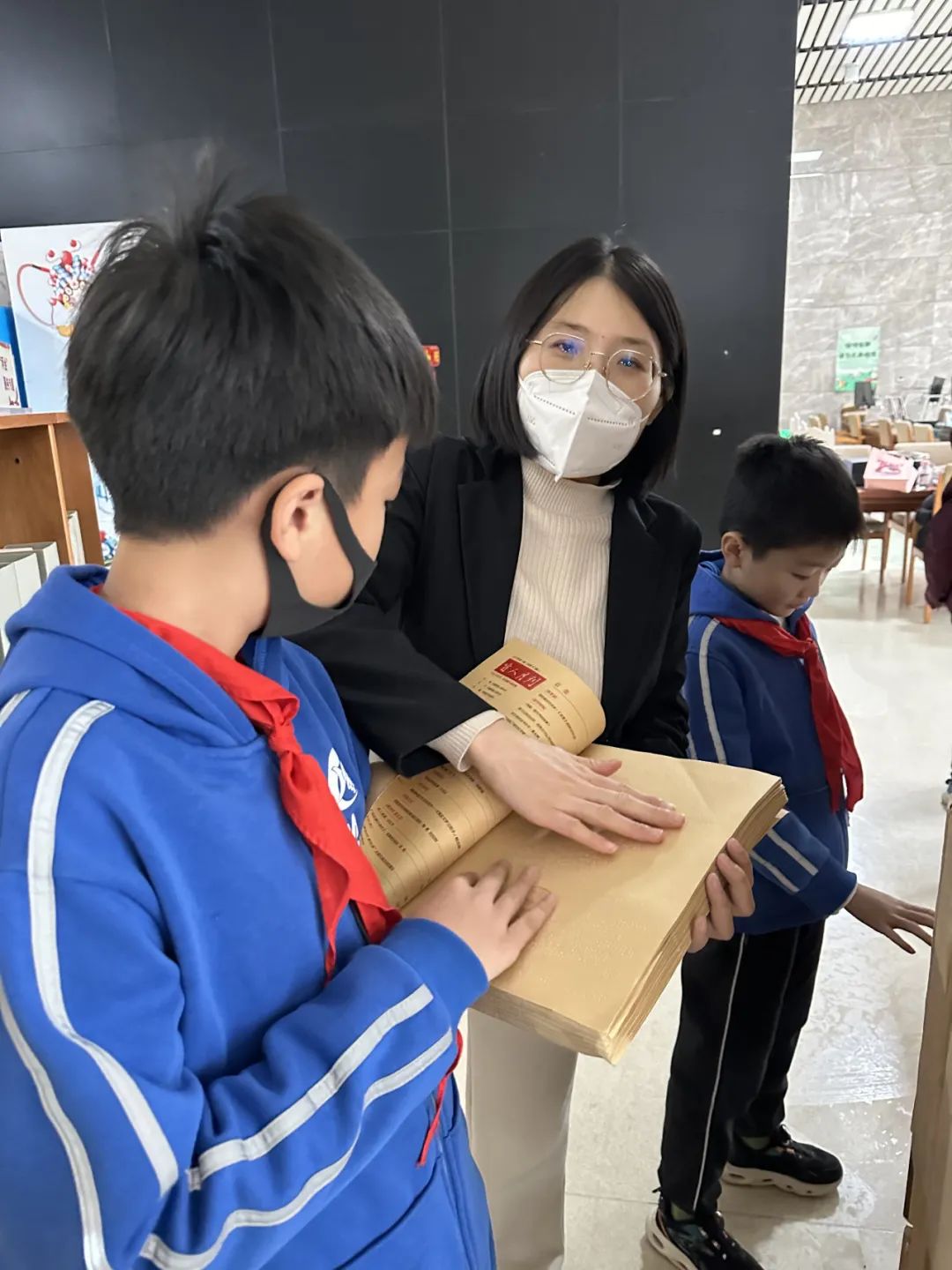 盲文阅读区域细节满满,不仅有盲人期刊,还有扫描试听区域,期刊类别也丰富多样。队员们抚摸着书籍上所看不懂的凹凸起伏的“文字”,感受盲人的世界,明白了讲解老师说的“我们要去关爱他们”。