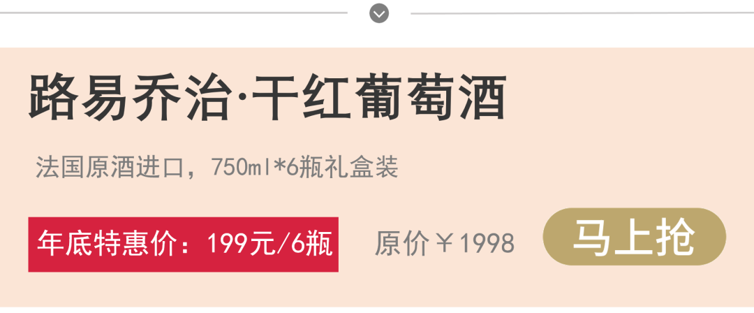 △国外商超在售但这样的高价,我真的高攀不起!!好在我们找到品牌,软磨硬泡把价格打到了地板价——年底酒水消耗量大,品牌也愿意让大家尝尝,不然根本拿不到这样的好价?公司聚餐、请客聚会带着它,大家喝得高兴,送人也拿得出手!情人节、朋友小聚需要烘托气氛,直饮或者煮一杯热红酒,更是恰到好处的浪漫,屡试不爽!再说一遍,199元(礼盒装:750ml*6瓶),这个价格相当于品牌让大家试饮了,交个朋友~但我也在这里提醒大家,过年自用的话不要过度囤货,把低价机会也留给别人一点,拜托大家啦??品葡萄酒,某种程度上与品白酒一样,在品尝味道之余,值得玩味的还有背后的历史传承、文化底蕴。这款干红葡萄酒,来自于古老的葡萄产区—法国朗格多克(Languedoc),它是法国的产酒大区。朗格多克共有 36 个法定产区,其葡萄种植面积约占全法的 1/3。这里盛产果香浓郁、热情洋溢的葡萄酒,深受葡萄酒爱好者的青睐。酒庄是路易乔治酒庄,位于法国西南部,是该产区知名的酒庄之一! 占地90公顷,酒庄葡萄园的土壤为硅质粘土和石灰岩,是种植葡萄的理想土壤。再加上典型的地中海气候,可以为葡萄提供充足的热量、水分和阳光,使得酿酒所需的果汁感更强,果汁浓郁。采用传统的栽培方法,如短枝修剪(每株葡萄树上仅仅保留六串葡萄),剪叶疏枝、葡萄采摘都由人工完成。因为夜晚温度较低,且没有阳光直晒,这样可以保留葡萄的香气与风味。采摘之后,葡萄就在发酵室中进行筛选,去梗,然后对葡萄进行轻缓压榨。 发酵静待18个月,酿制时间长,粗糙的单宁慢慢变得细腻,葡萄酒的香味也愈加丰富。酒庄用心的酿造工艺,加上别处难寻的葡萄原料,使得这款路易乔治·查尔斯干红简单易饮,干净纯粹,堪称一绝的葡萄酒风味。说完出身,再细究一下原料,你就更加知道这瓶好酒是怎么来的!随着葡萄藤年龄的增长,其产量逐渐降低,葡萄的质量会得到相对提高。所以,越老的葡萄藤所生产出来的果实风味会更加浓郁、酿出来的酒品质也更出众。酿成的葡萄酒不需要太长时间的橡木桶陈年就能达到酿酒师想要的酒体和口感!一般来说,老酒客只要开瓶,就能知道这酒是不是老藤的果实酿造,味道的持久力真的不一样?这款酒用的是丹魄+歌海娜混合酿制,增强葡萄酒的香气、颜色、口感、酒体乃至余味??丹魄:具有红浆果、紫罗兰和甘草等浓郁香气,陈年后会散发出黑色水果、烟熏、蜜饯、香草和巧克力等香味。?歌海娜:含有?草莓、蔓越莓等红色水果香气,陈年会发展出皮革、焦油和太妃糖的风味。涩度酸度较低,酒精含量较高,甜度较高。保持低温环境,抑制酵母活性,阻止发酵过程,可以提升葡萄酒的香气和风味。这瓶酒就是这样。它的浆果香气喝起来并不会让人感到腻口,酒体比较轻盈。这款酒的酒精度是14.8%vol,也能说明它的难得。因为酒精度是葡萄糖份的转换,小数点后的这个糖份转换洒精度数很难,对采摘葡萄的时间、手法,发酵要求都非常高。用舌头慢慢搅动葡萄酒,酒液充分与舌尖舌根接触,精细、柔顺、口感非常饱满!相信我,过年和亲朋好友相聚,桌上有它是锦上添花;约会或一人独酌,生活有它是仪式感爆发。我特别喜欢用它做热红酒,两三杯下肚,整个人都变得欢快起来~包装非常精致,一盒6瓶,特别适合走亲访友,从里到外都是高级感,拿来送人别提多有面儿!对于葡萄酒爱好者来说,不仅是一款美酒,更是一件值得珍藏的艺术品。单瓶市场价就要1998元(*一瓶一码,扫码价也是1998元/瓶,大家可以自行查验),对得起它的品质。
