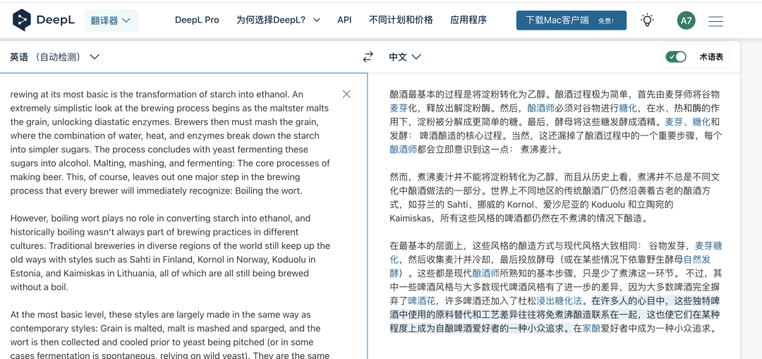上一篇不煮沸浑浊IPA的那篇文章的节选翻译效果,可以看到需要我人工修改的内容并不多。