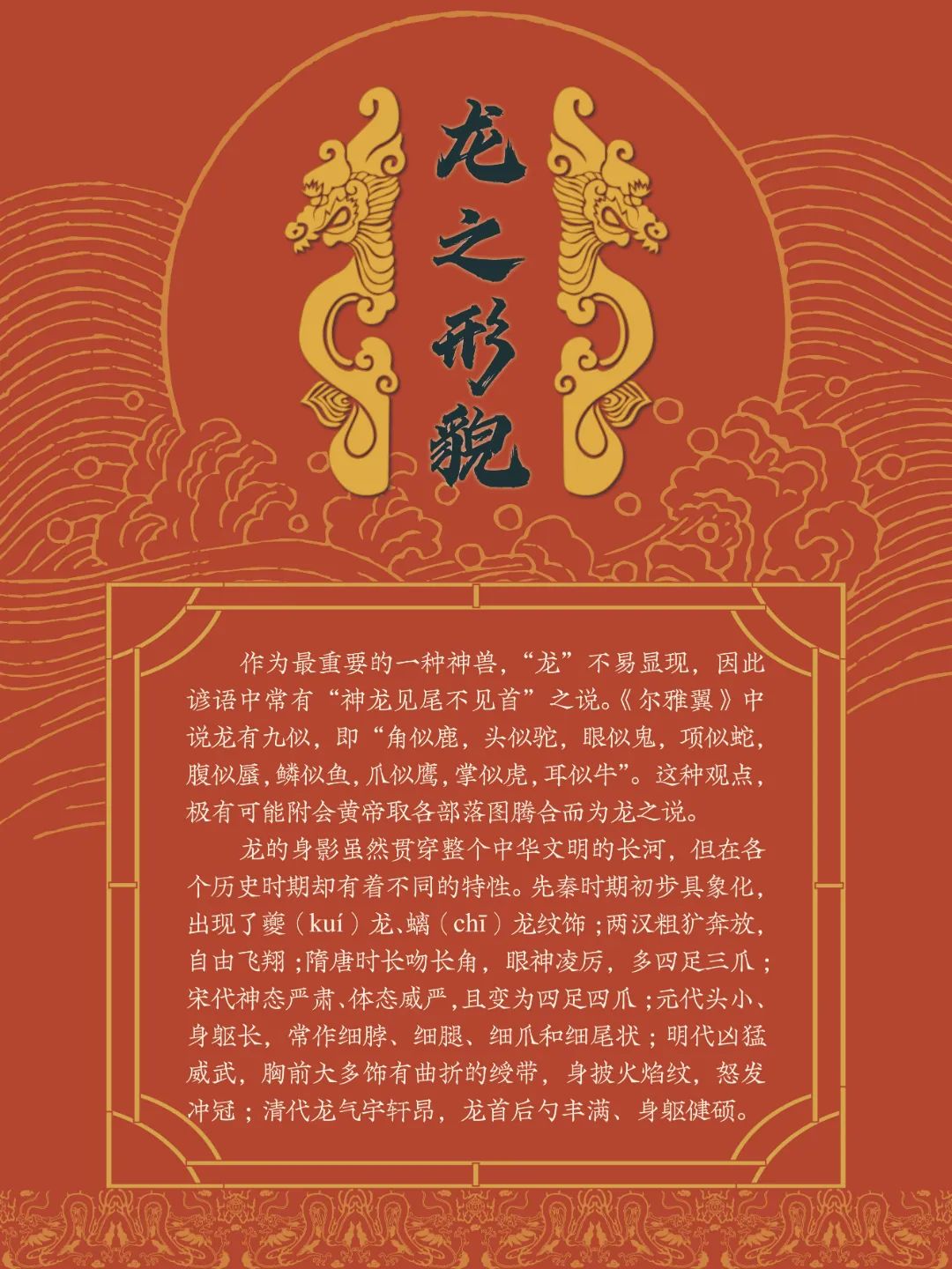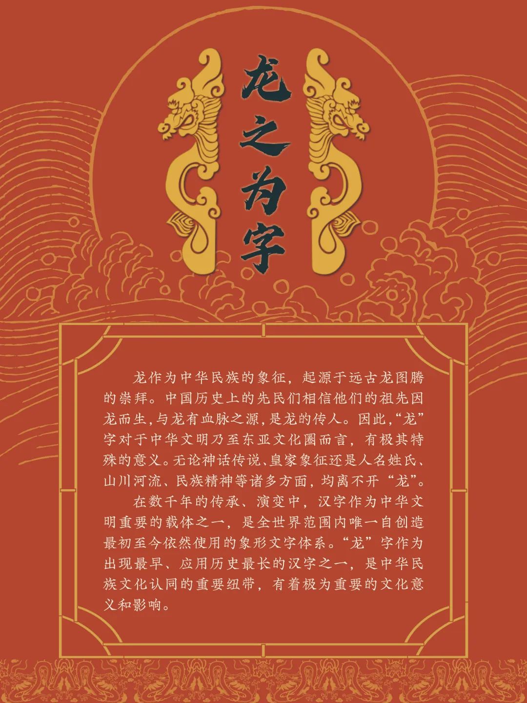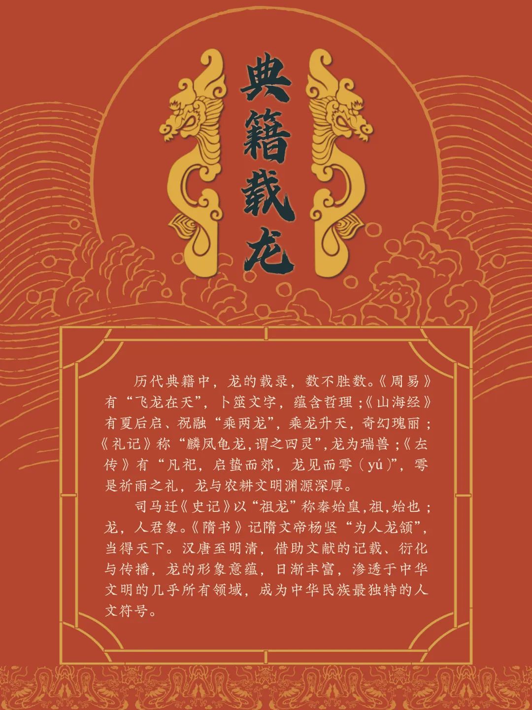 中国龙横空出世,已逾八千年。龙从远古图腾、古老星象、神人坐骑、端午风俗,至汉代定型为帝王化身。龙高踞九重宫阙,也活跃于百姓日常,融入文学艺术和民族情感中,几乎无所不在。本次展览将从“龙之为字”“龙之形貌”“龙之历书”“人中之龙”“典籍载龙”五个单元,带领读者深入了解作为中华民族之象征的龙文化,为甲辰龙年增添一抹书香。