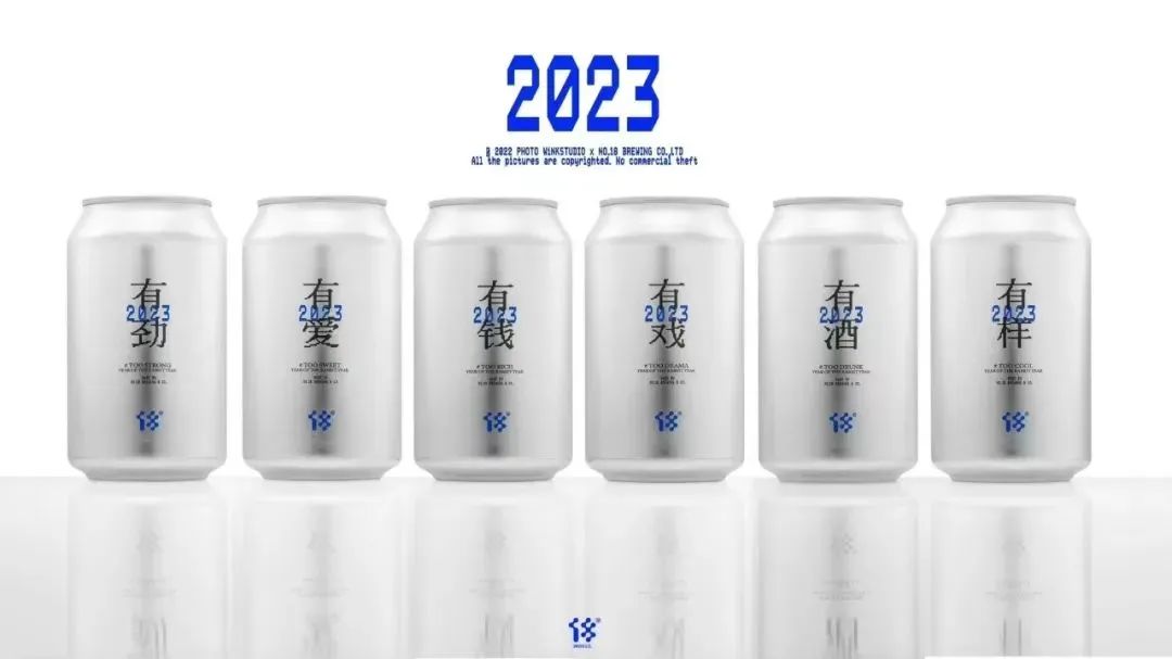 包装上,拾捌精酿一反新年红色气氛,采用犀利的银蓝黑配色。银色罐身,搭配天蓝色的LOGO和“2023”字样,并分别印上了“有钱”“有酒”“有爱”“有劲”“有戏”“有样”六个不同的主题,以简洁突显简单的祝福,以大面积的留白,带给消费者对新年的畅想。