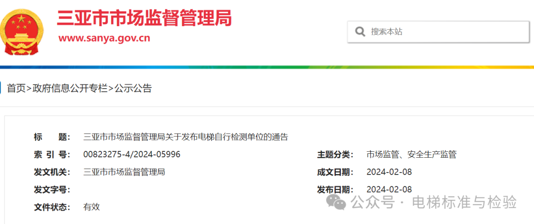 三亚市市场监督管理局关于发布电梯自行检测单位的通告