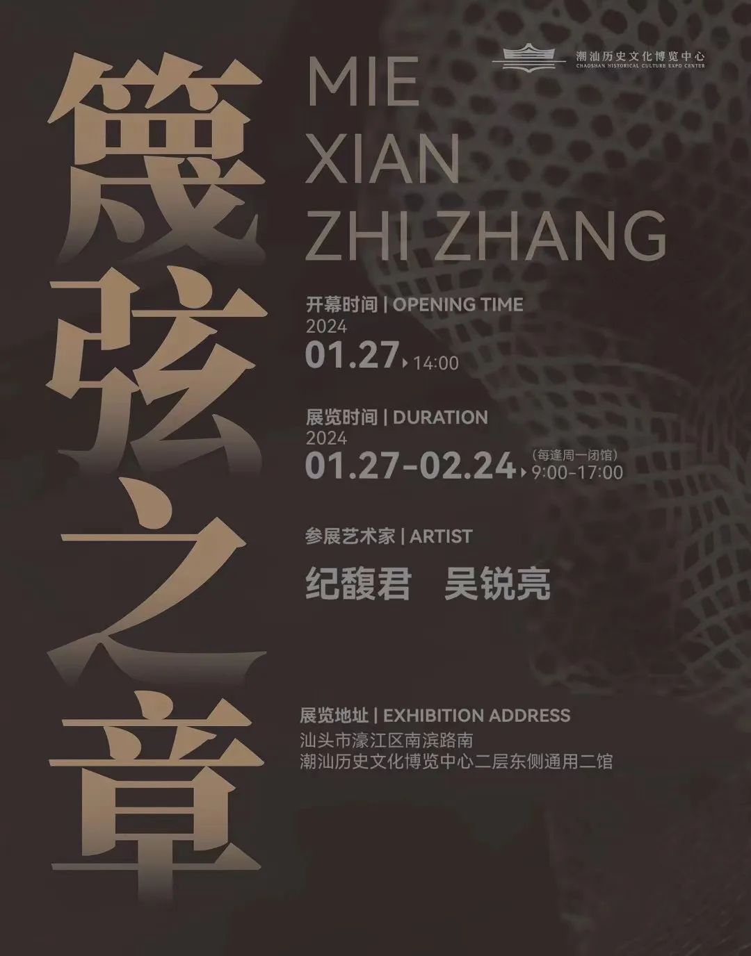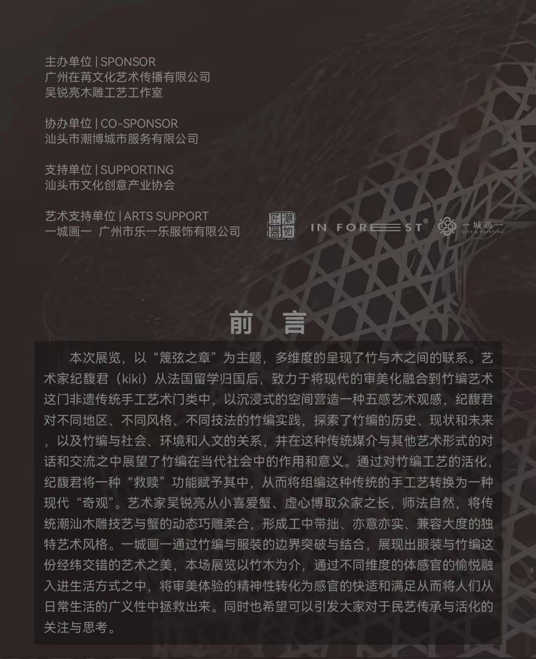 由广州在苒文化艺术传播有限公司、吴锐亮木雕工艺工作室主办,汕头市潮博城市服务有限公司协办,汕头市文化创意产业协会、广东公子文化发展有限公司支持,一城画一、广州市乐一乐服饰有限公司艺术支持的“篾弦之章”当代装置艺术展览将于1月27日14:00在潮汕历史文化博览中心(以下简称:潮博中心)二层东侧通用二馆开幕。