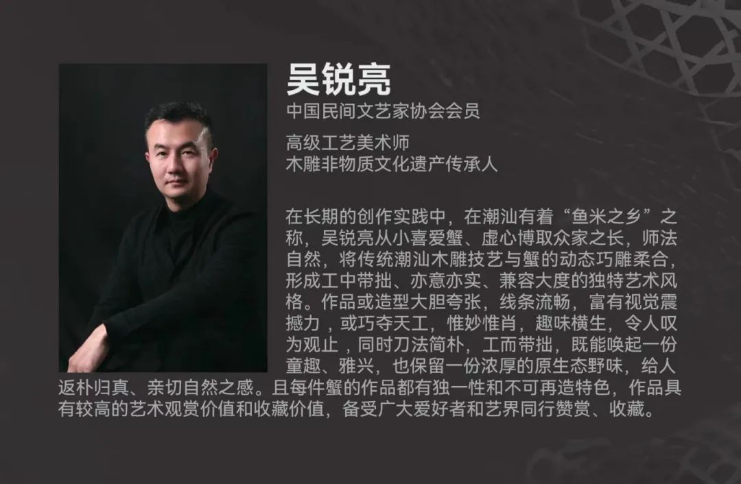 参展艺术家吴锐亮从小喜爱蟹、虚心博取众家之长,师法自然,将传统潮汕木雕技艺与蟹的动态巧雕柔合,形成工中带拙、亦意亦实、兼容大度的独特艺术风格。
