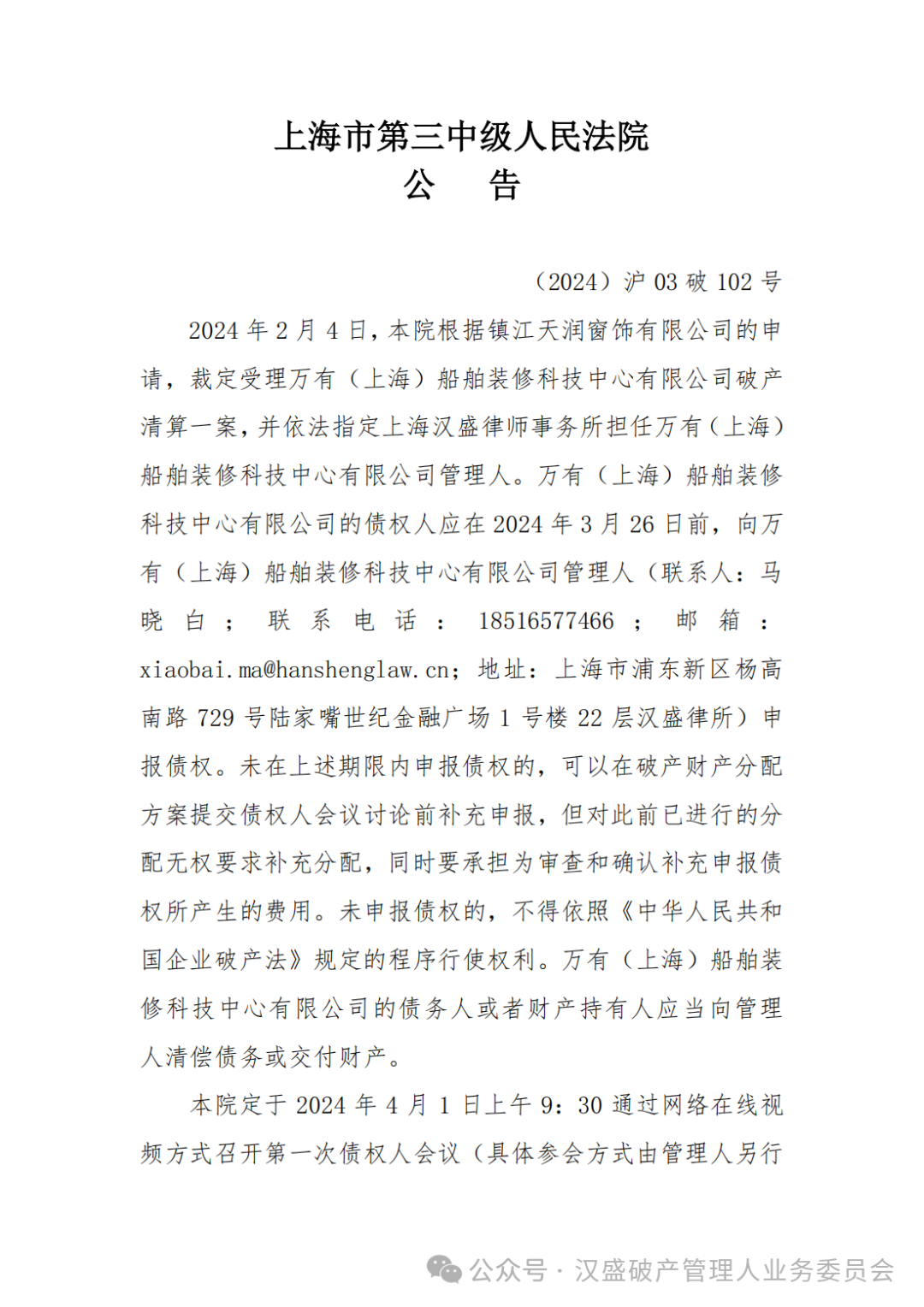 2024年2月6日,上海市第三中级人民法院通过全国企业破产重整案件信息网发布了破产公告,万有(上海)船舶装修科技中心有限公司债权人应在2024年3月26日前,向管理人(联系人:马晓白;联系电话:18516577466;邮箱:xiaobai.ma@hanshenglaw.cn;地址:上海市浦东新区杨高南路729号陆家嘴世纪金融广场1号楼22层汉盛律所)申报债权。