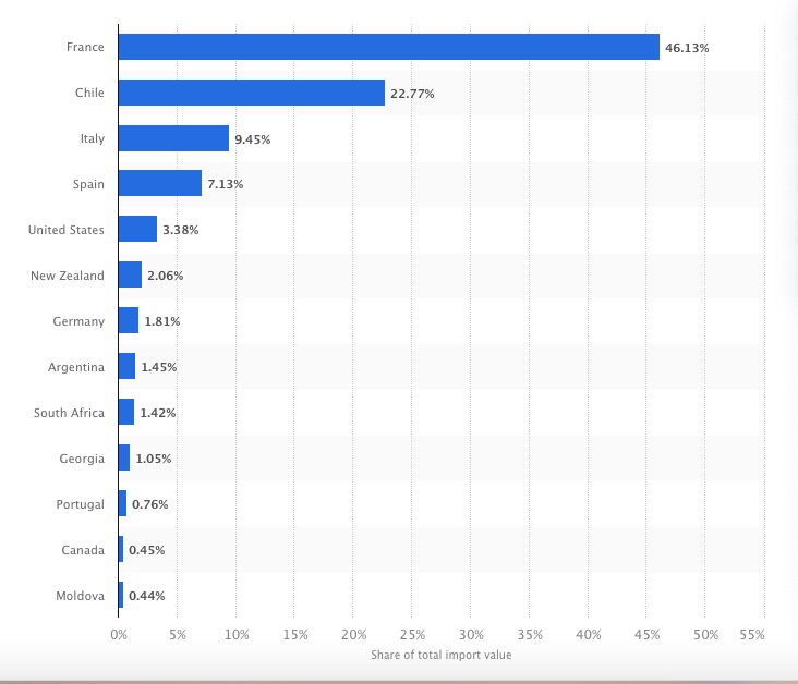 根据2023上半年的官方数据,法国对中国的葡萄酒出口额以46.09%的占比排在首位。紧随其后的是智利,占比16.45%,意大利占比10.64%。