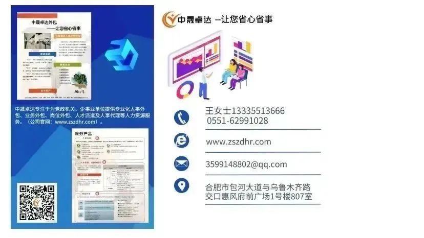 1、政治立场坚定,能认真贯彻执行党的方针、政策,有组织观念和大局意识;能坚持原则,秉公办事,团结协作,作风正派,廉洁自律;2、有强烈的事业心、责任感,甘于吃苦,乐于奉献,工作积极主动;3、有一定的组织协调能力,具备岗位所需要的相关知识和工作经验,能积极主动工作;3、曾被国家机关、事业单位或企业辞退或开除公职的;6、参加非法组织、邪教组织或从事其他危害国家安全活动的;本次招聘采取社会化招聘,根据岗位要求合肥中晟卓达人力资源管理有限公司(以下简称:中晟卓达)面向社会进行招聘,由中晟卓达组织在公共平台发布公告、报名、资格审查、面试筛选等工作。最终不少于1:2的比例进行面试。1、填写报名表(见附件1)并按:姓名+学历+岗位名称方式命名,发送至邮箱3599148802@qq.com(未使用附件1模板的简历视作无效);2、可提供个人补充材料,如获奖证书等(自选项,不作统一要求);1、参加面试的人员须先进行资格复审。被确定为资格复审的人员,需在规定的时间内携带本人正式有效身份证原件及复印件、学历证书及其他相关证书原件及复印件,相关工作经验证明材料,到指定地点进行资格复审。由合肥中晟卓达人力资源管理有限公司推荐的候选人,公司将组织面试,具体事项以公告及电话通知为准。在拟录用人员入职前须在三甲医院进行体检,对于不提供体检报告的视为自动放弃。体检合格人员为拟聘用人选,在中晟卓达公司官网上向社会公示3天。公示期满后,公示无异议或有异议但不影响聘用的即办理正式入职手续,与中晟卓达公司签订劳动合同(试用期一个月)。1、咨询电话:0551-62991028、18256076507 刘女士(微信同号)2、查询媒体:中晟卓达公司官网(http://www.zszdhr.com) 合肥中晟卓达人力资源管理有限公司