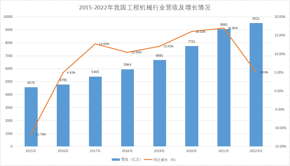 根据中商情报网整理的最新数据,2017年到2021年始终保持10%以上的增长率,2022年工程机械行业营业收入预计超9500亿元,同比增长5.03%,增长率有所下滑,下降原因主要是受行业景气度影响。按照行业3-5年左右的景气周期计算,目前我国工程机械行业已面临调整窗口。以主流工程机械产品挖掘机的销量来看,截至2022年年末,挖掘机全年销量261346台,同比下降23.8%。具体到国内外销量来看,国内挖掘机累计销量为151889台,同比下降44.6%,创近五年最大降幅;出口挖掘机累计销量109457台,同比上升59.8%,延续了2021年的高速增长。2022年挖掘机整体销量下滑严重,主要受行业景气度、疫情和房地产开工面积下降等因素影响,随着疫情政策调整后带来的国内市场复苏和国外市场需求的进一步加大,2023年有望好转。具体到月度数据看,挖掘机销量呈现波浪形,3月份挖掘机销量达到峰值37085台,前半年挖掘机销量增速始终位于水平面之下,三季度开始有所好转,除12月受疫情政策调整增长率大幅下滑外,下半年的增长率持续好转。国内挖掘机销量与总销量趋势保持一致,但出口挖掘机销量较为稳定,12月份出口销量更是远超国内销量。具体到增长率数据看,全年挖掘机销量增长率呈现前低后高行情,前半年总销量增长率始终位于水平面之下,三季度开始有所好转并持续走高,12月份受疫情政策调整影响重回水平面之下。国内挖掘机销量持续2021年下半年开始的不景气行情,增长率仅11月为正,其余月份降幅较大;出口挖掘机销量全年保持20%以上的增长率高速增长,增长率峰值为105%,出口成为挖掘机销量的稳定器。长沙工程机械集群顺利通过工信部验收,标志着长沙工程机械产业集群正式进入工信部世界级先进制造业集群培育池。三一重工与蒙发能源集团签署战略合作协议,双方将在矸石充填、煤矿开采和新能源领域展开深度合作,共同推动煤矸石循环利用和绿色矿山建设,矿山设备或成工程机械行业新突破口。临工重机发布官方消息称,公司拟投资7.5亿元建设临工济南重机超大型挖掘机及新能源矿车项目。项目建成后可实现年产宽体自卸车8000台、新能源矿车3010台、铰卡400台、打桩机650台、超大型挖掘机630台,合计12690台机械设备的生产规模。柳工成功下线第2000台电动装载机,标志着柳电动装载机产量率先突破2000台,创造电动装载机新的里程碑,彰显了柳工在电动装载机行业的领导地位。柳工自主研制首台“可换又可充”电动挖掘机,开创了国内工程机械电动化新历史,填补电动挖掘机在换电领域的空白。12月1日起,非道路移动机械“国四”标准正式实施。根据规定,禁止生产、进口或者销售大气污染物排放超过标准的非道路移动机械。2020年,工信部发布了《推动公共领域车辆电动化行动计划》,推进工程机械电动化、加快工程机械行业向绿色化发展已是大势所趋,目前各大工程机械厂商纷纷布局电动工程机械行业。2015年以来,主要工程机械保有量呈现持续上升的态势,目前我国的主要工程机械保有量超900万台,较2015年的673万台增长了近35%,价值超万亿元,其中纯电动工程机械占比较低。随着环保政策的趋严和新能源技术的不断发展,绿色能源的工程机械占比将持续上升,业内人士预测2025年纯电动工程机械的行业渗透率将由2021年的不足1%上升至25%,保有量的转化和新增购买需求将共同推动工程机械产品销量的增长。国内工程机械出口TOP10目的国主要以“一带一路”沿线国家和RCEP协定国为主,其中有5个国家为“一带一路”沿线国家、5个国家为RCEP协定国,二者合计有7个国家。随着政策效果的持续显现,工程机械出口有望持续保持高速增长,未来外销仍将是工程机械销量的主要增长点。新年到来,全国多地纷纷举行重大项目集中开工签约和投产投用等活动,合计总投资达21022.39亿元。中国财政学会绩效管理专委会副主任委员张依群表示,投资是拉动经济增长的有效方法之一,保守估计2023年全年固定资产投产增速会在5%以上,乐观估计会在10%左右。基建投资的增加,对目前正处于下行周期的工程机械行业,可以起到一定的对冲作用,未来内销数据有望好转。
