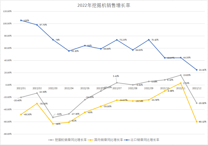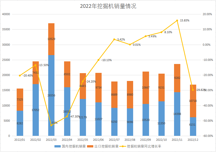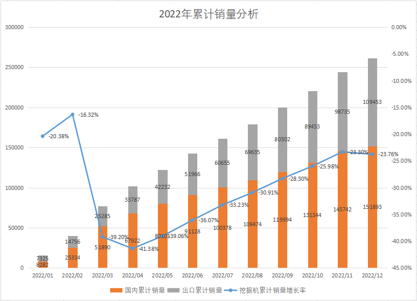 2023年1月10日中国工程机械工业协会发布了12月份挖掘机的销量数据,挖掘机(含出口)销量16869台,同比下降29.8%,其中国内挖掘机销量6151台,同比下滑60.1%;国外挖掘机销量10718台,增速为24.4%。2022年全年共销售挖掘机26.13万台,同比下降23.8%,销售状况不容乐观,本文对工程机械行业全年情况进行回顾并对2023年进行展望分析。