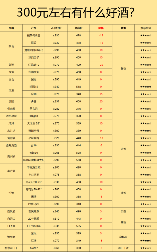 300左右的酒,可以看作是承上启下的分界线。一方面是酒质上有大幅提升,用的基酒等级更高,参与勾调的老酒年限都比较长,不乏10年、15年、20年、25年老酒加入其中。另外一方面,使用场景也发生了根本变化。300元虽然已经脱离了大众口粮酒的范围,但是依旧是现在消费的主力区间。这个价位段的产品更多的是出现在商务、宴请以及春节等比较有纪念意义的家庭聚会。
