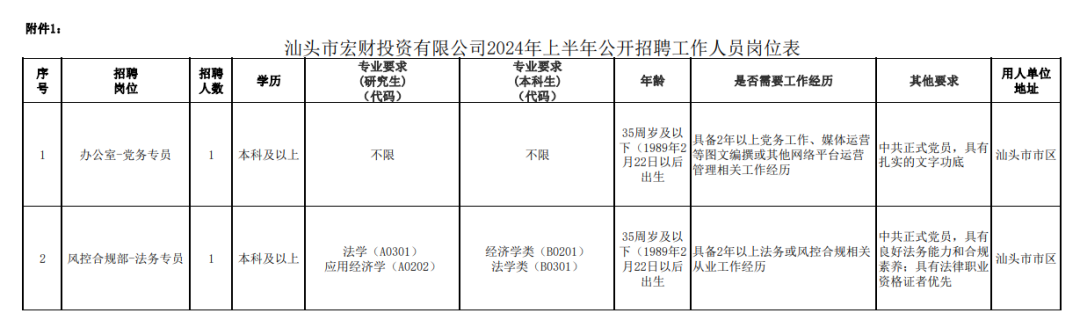 汕头市宏财投资有限公司(下称“公司”)是汕头市人民政府国有资产监督管理委员会出资、汕头市金融工作局监管的市属国有企业。为全面加强国有企业党建引领,推动国资国企高质量发展,结合公司队伍建设实际需要,本着“坚持党建工作和业务工作一起谋划”和“公开、平等、竞争、择优”的原则,拟面向社会公开招聘工作人员2名。