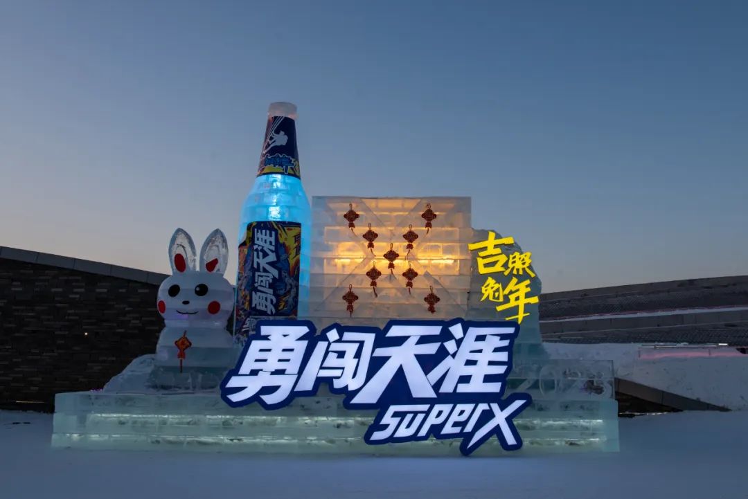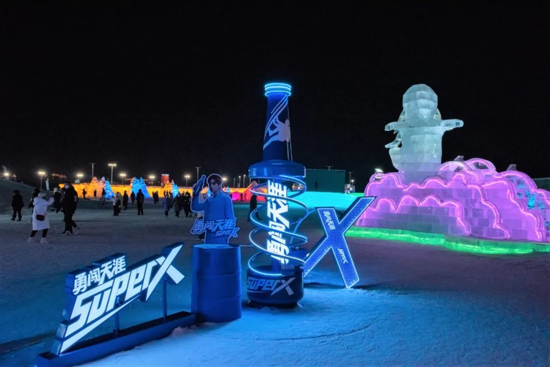 勇闯天涯superX吉照兔年,点亮哈尔滨冰雪大世界。啤酒瓶、萌兔、中国结,配上剔透的冰体和炫彩的灯光,在冰雪筑造的世界里分外引人注目。