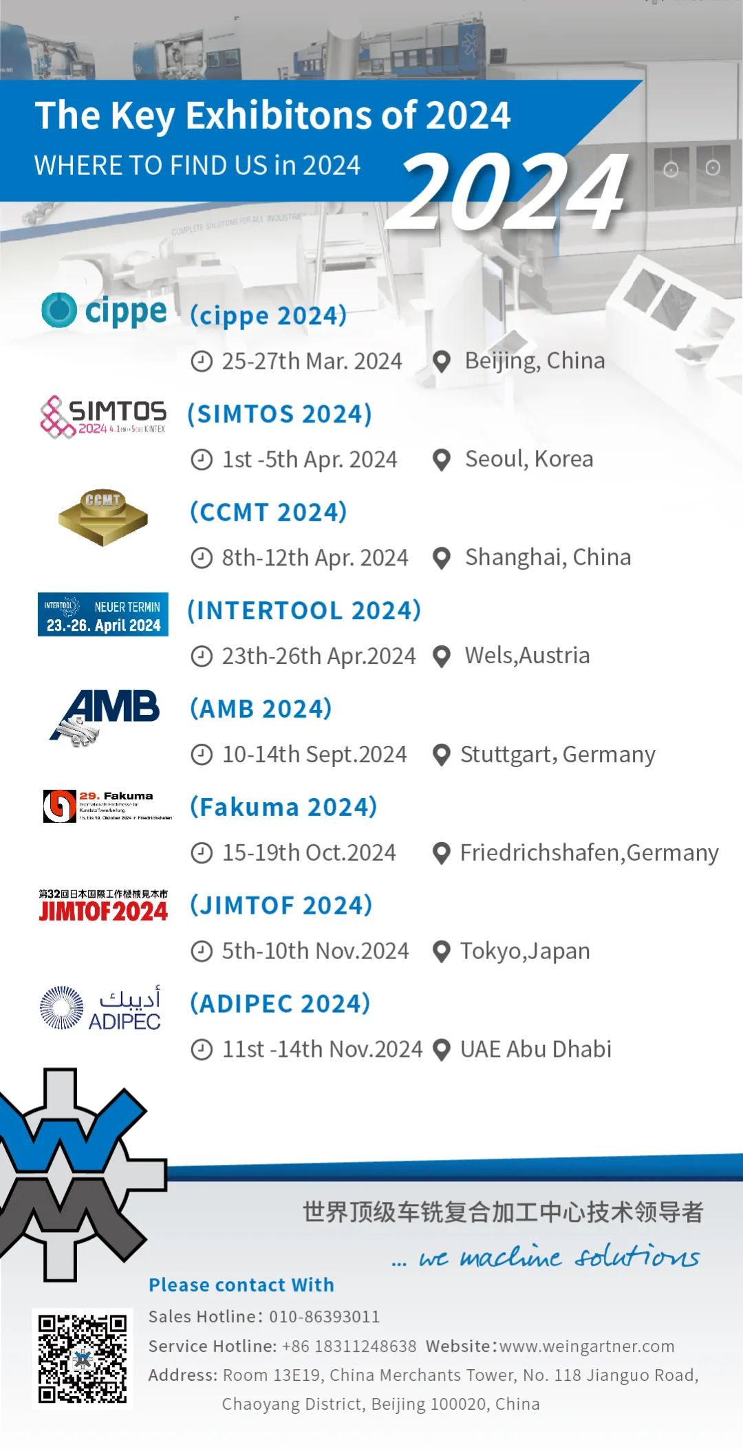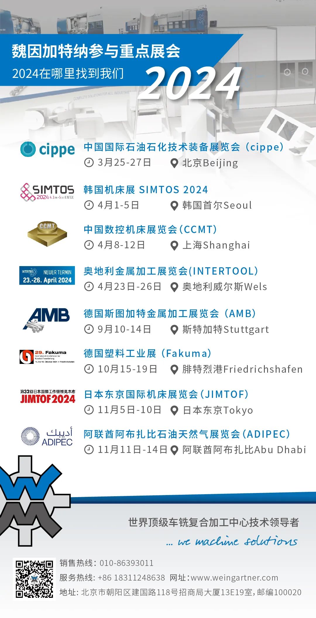 我们很高兴地宣布:2024年魏因加特纳机械制造有限公司将参加以下世界知名的展会。魏因加特纳公司制定了全球市场布局、产品研发与生产、扩大产能等方面的计划、以确保持续增长。公司将继续深耕亚太市场,不断提升市场份额,此外,在技术创新和研发方面积极投入,确保实现在该区域的可持续发展。