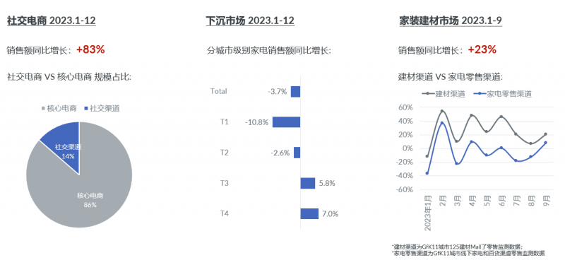 从企业端来看,家电行业头部企业在实践中探索优化零售渠道策略。海尔在线下渠道一二级市场重点布局 shopping mall、前置家居类渠道的门店建设,在三四级市场,强化商圈门店的高端成套销售能力建设;在线上渠道提升综合类电商平台资源配置效率,强化内容电商平台的内容生产、店铺运营能力,构建场景直播竞争力,实现用户交互及交易转化。海信通过对零售门店分级分类精细化管理,提升整体运营质量。在2023年上半年,新增专卖店近千家,规模同比提升25%,实现了海信空调单店效率同比提升19%,容声冰箱单店效率同比提升10%。
