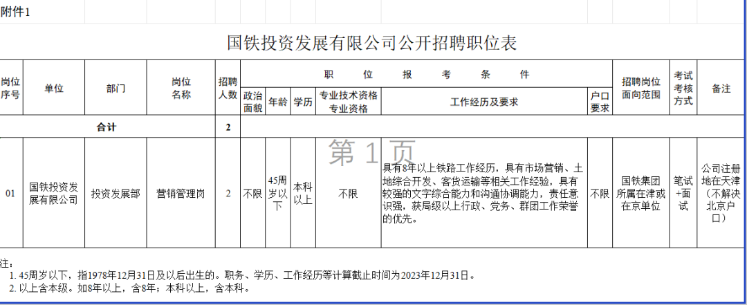 国铁投资发展有限公司定位为全路性土地综合开发经营平台,为中国铁路投资集团有限公司子公司,注册资本金11.77亿元。主要负责土地综合开发项目投资与实施,重点聚焦既有铁路土地资源盘活、新建铁路土地综合开发、TOD及站城融合综合开发、存量资产运营管理等业务,积极探索实践多渠道融资模式,广泛吸纳社会资本,以市场化方式整合路内外优质产业资源,推动构建铁路土地综合开发领域的产业发展联盟,着力打造具有铁路特色的土地综合开发业务体系。根据工作需要,现公开招聘工作人员,有关事项公告如下。此次招聘1个职位共2名工作人员,各职位应聘资格条件见《国铁投资发展有限公司公开招聘职位表》(附件1)。1. 拥护中国共产党的领导,遵守中华人民共和国宪法和法律;具有良好的品行,作风正派,勤奋敬业,无违法违纪等不良记录;2. 具备招聘职位要求的年龄、学历和工作经历要求等条件(详见附件1);3. 现为国铁集团所属在津或在京单位在编管理和专业技术岗位人员,并与所在单位签订劳动合同;应聘人员的年龄、职务、学历、工作经历等计算截止时间为2023年12月31日。出生日期以人事部门按照有关规定核定结果为准;学历和所学专业以毕业证书为准;工作经历、职务以人事命令为准。2. 曾被开除公职的或因违法违纪被解除劳动合同的;5. 在近三年各类招考过程中被招聘单位或主管部门认定有弄虚作假或作弊行为的;6. 近三年年度考核等次有过基本称职或不称职等次的;
