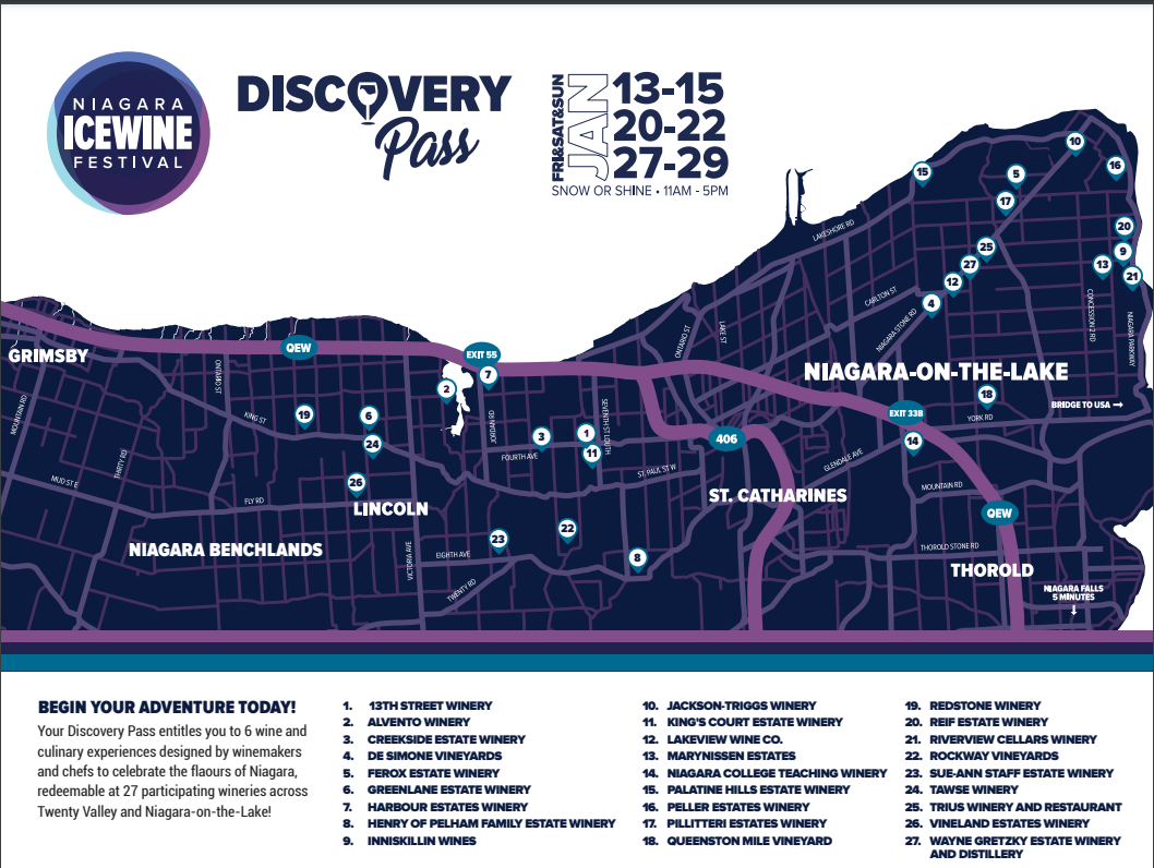 每个通行证提供六种美味的食物和葡萄酒搭配,供你选择的参与酒庄使用。2023年共有27家酒庄参与!Discovery Pass让你可以享用一些美味的甜味、辛辣和咸味食物以及冰酒搭配。
