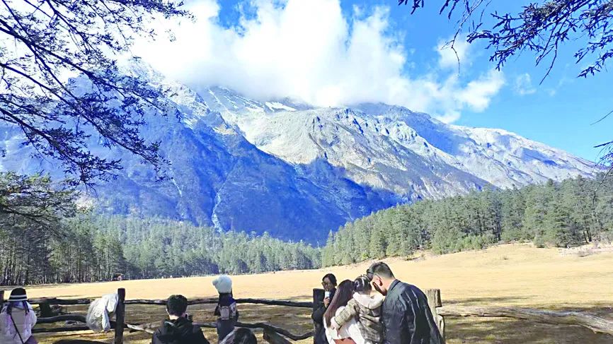 云杉坪是著名的山腰大草甸,也是观玉龙雪山最佳处。此处离雪山最近,山顶的雪峰、冰川看得十分真切。那顶峰上常年覆盖着的洁白的积雪,在阳光照射下闪耀着一派银光,宛如一方可望而不可即的圣域,而山巅笼罩着的浓密的云雾,更加平添了这仙境的神秘氛围。