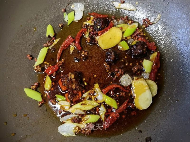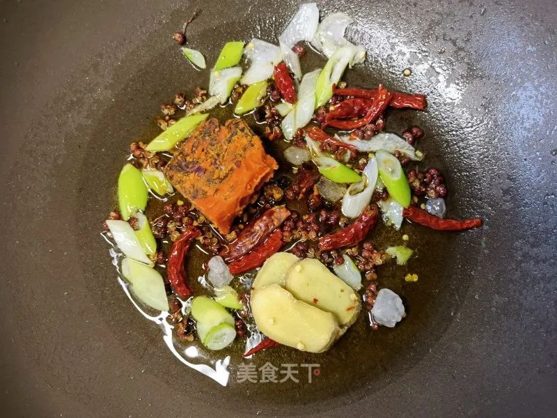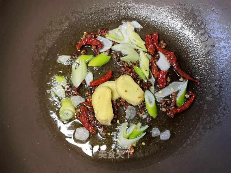 7. 锅里适量油烧热,葱姜,花椒,辣椒,冰糖炒一下。