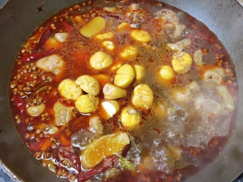 板栗、鸡腿、螺丝椒、小米椒、啤酒大半瓶、玉米油、葱姜、花椒、辣椒、冰糖、火锅底料、盐、生抽、白胡椒粉。
