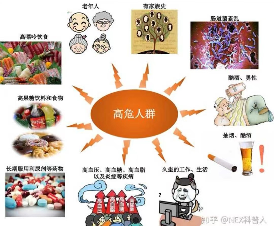 (1)、对于痛风反复发作(≥ 2 次/年)、有痛风石、尿酸性关节病和(或)肾结石的痛风患者,都建议降尿酸治疗,不管年轻人或老年人。而合并有肾功能不全、高血压、冠心病、糖尿病等的人群,更需要积极治疗。