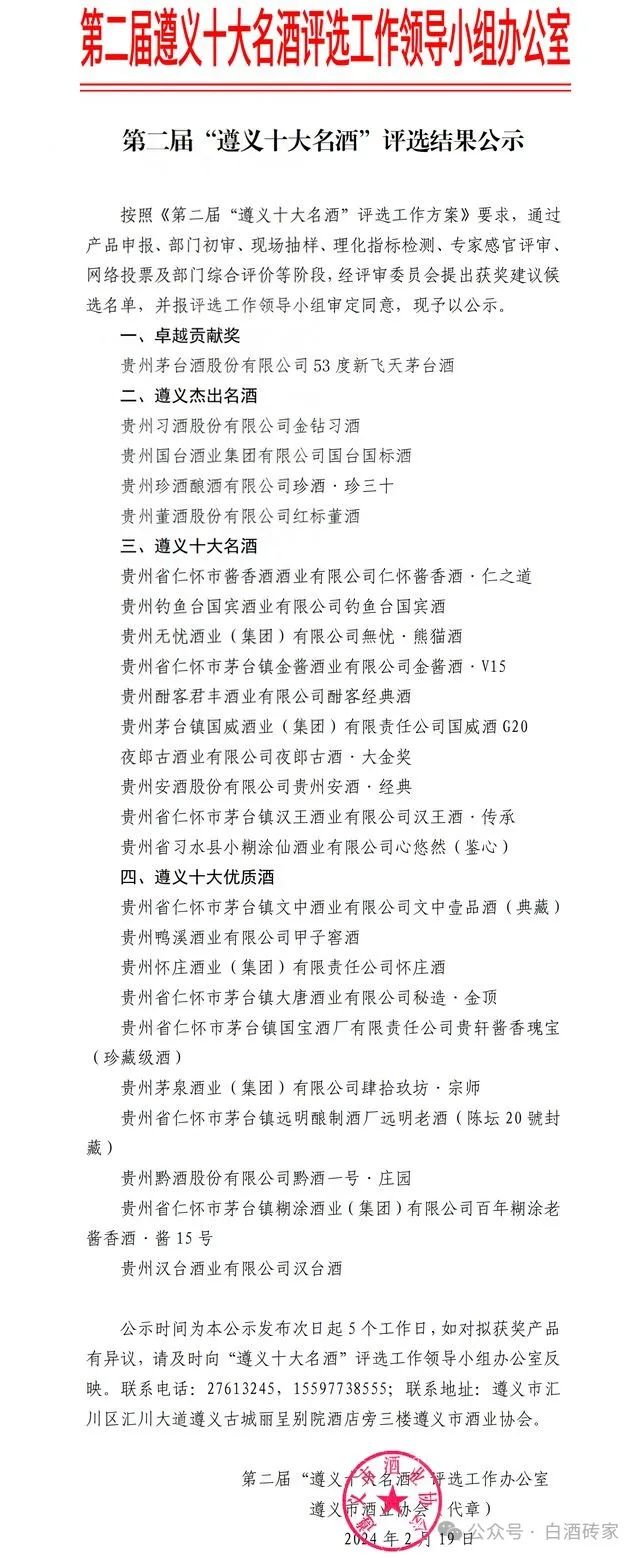 贵州省仁怀市酱香酒酒业有限公司仁怀酱香酒·仁之道、贵州钓鱼台国宾酒业有限公司钓鱼台国宾酒、贵州无忧酒业(集团)有限公司無忧·熊猫酒、贵州省仁怀市茅台镇金酱酒业有限公司金酱酒·V15等拟获遵义十大名酒,贵州省仁怀市茅台镇文中酒业有限公司文中壹品酒(典藏)、贵州鸭溪酒业有限公司甲子窖酒等获遵义十大优质酒。