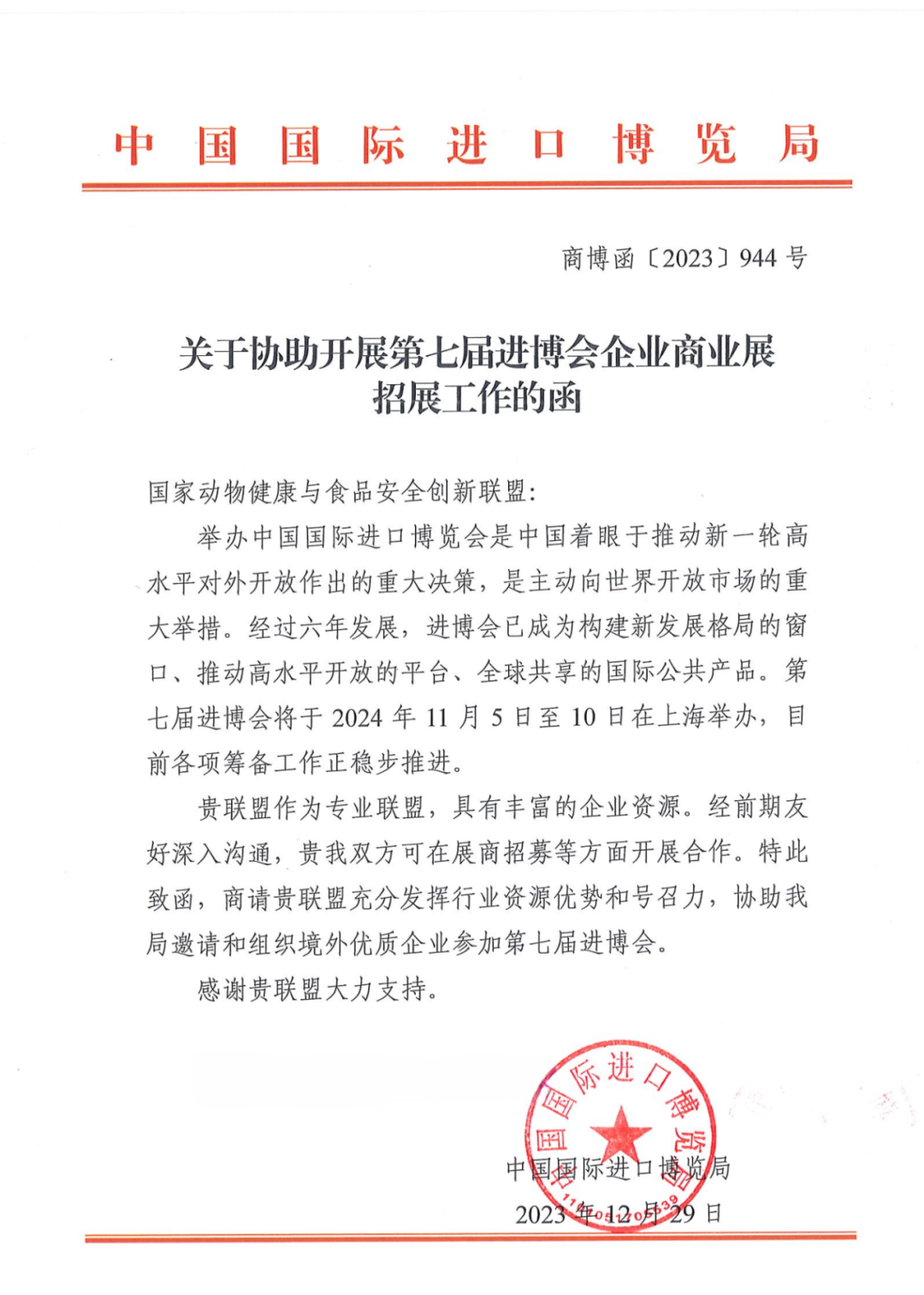2023年11月7日,国家动物健康与食品安全创新联盟与通用磨坊(中国)投资有限公司共同举办的第六届国际进口博览会国际宠物健康与营养高峰论坛在国家会展中心隆重举行。国家动物健康与食品安全创新联盟受中国国际进口博览局委托,协助邀请和组织境内、外优质企业参加第七届进口博览会。