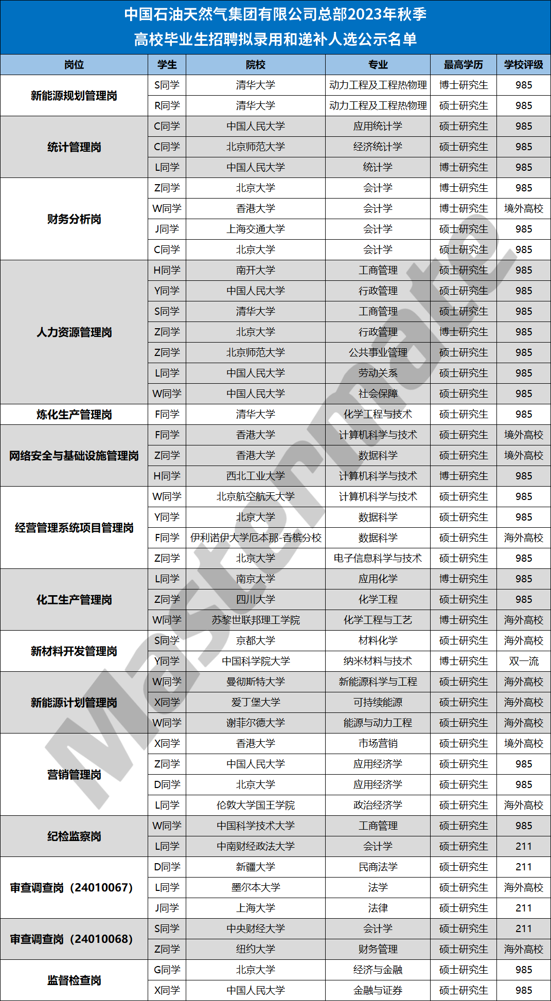 最近,中石油的秋招录用名单公布了。统计了一下,45个名额中,有27人来自985高校、13人来自海外或境外院校、211院校有4人、双一流有1人。通过数据能够明显看到985和海外或境外高校的学生,优势明显。