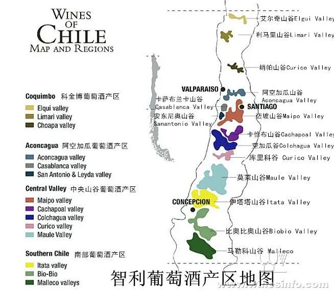 葡萄园主要集中在安第斯山脉和海拔不太高的肥沃谷地平原。智利正式的葡萄酒产区是依据行政区由北往南划分。