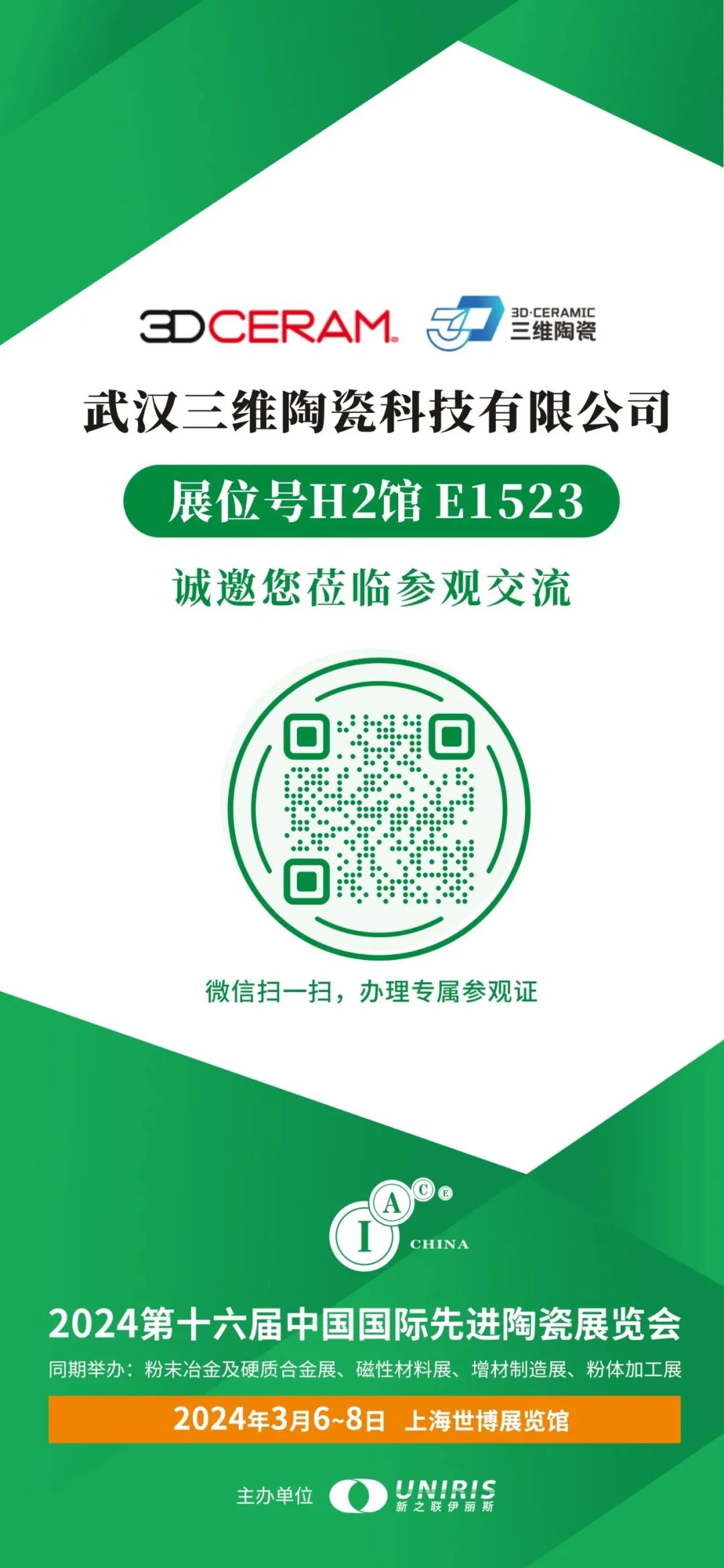 武汉三维陶瓷科技有限公司将在2024年3月6-8日参加在上海世博展览馆举行的《2024中国国际先进陶瓷展》,展位号H2馆E1523。在此,诚挚邀请您莅临参观交流