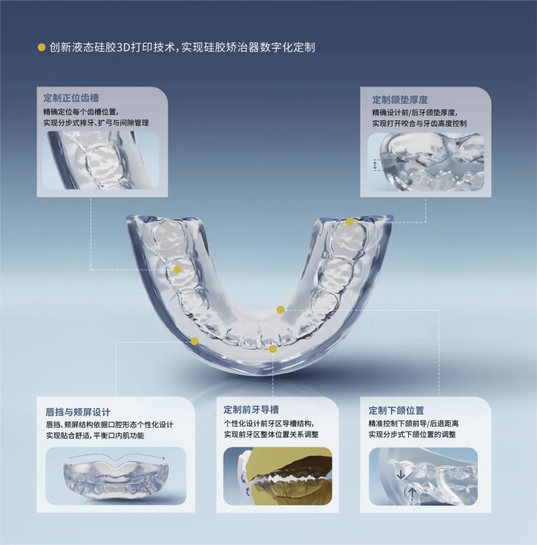 提供硅胶正畸全产品线、 整套硅胶正畸方案设计随口腔形态个性化设计,舒适贴合。