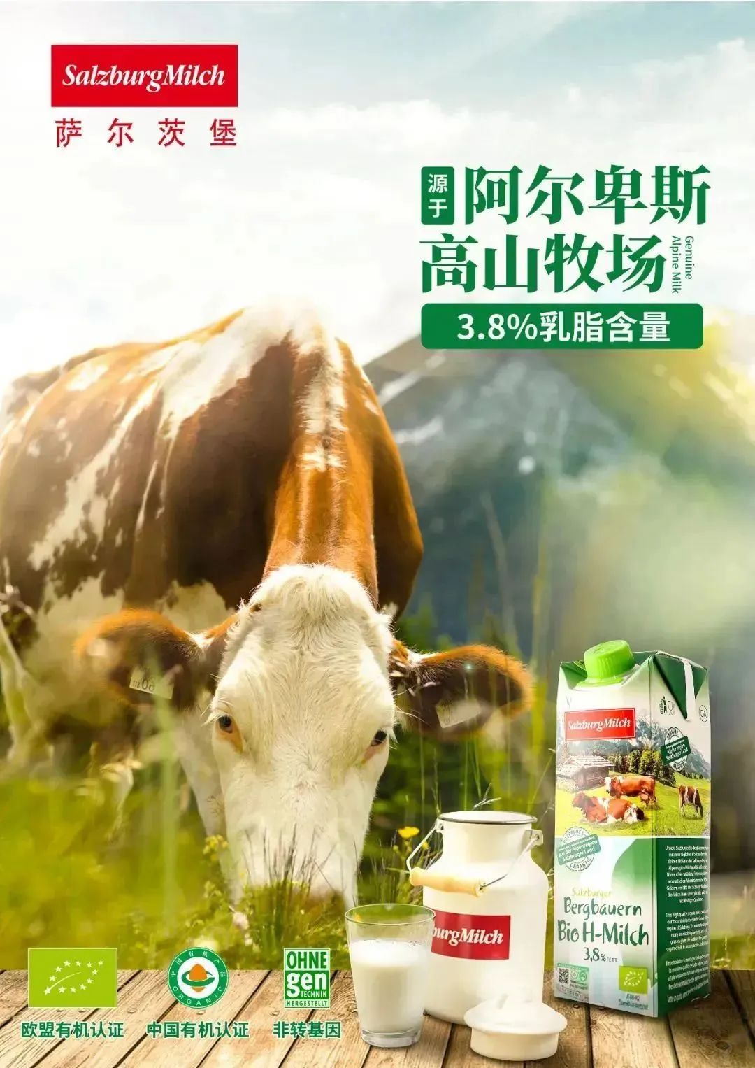 萨尔茨堡牛奶全部来自海拔1450米的阿尔卑斯高山牧场,优质奶源,非转基因,其有机系列,乳脂含量高达3.8%,获得欧盟-中国双重有机认证。