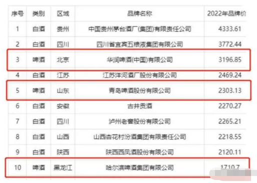 国产啤酒品牌价值榜单第10名是广州生力啤酒,品牌价值48.49亿元。生产制作的啤酒屡获国际品质评选会授予多项今金奖,色泽金黄,酒质芬芳,酒味甘香醇厚;湖北金龙泉排在榜单第9名,品牌价值71.99亿元。拥有国内先进的糖化、酿造、滤酒及灌装设备,并不断引进先进的工艺技术,相继开发了纯生、纯麦、王牌、黑啤等产品。