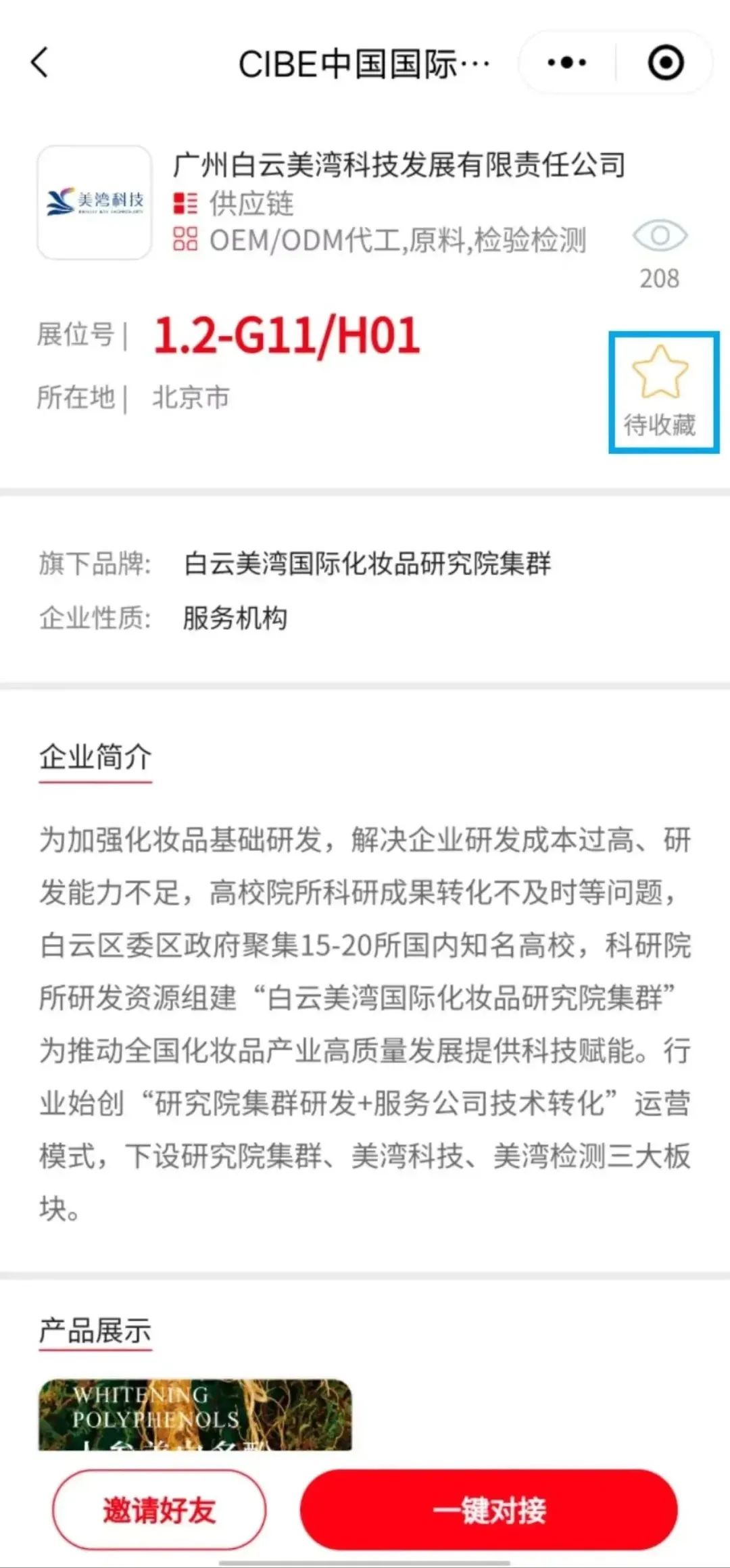 点击“五角星”图标可将该展商加入个人收藏,且在【我的】-【收藏】的“展商”中可以查看到用户的收藏内容。
