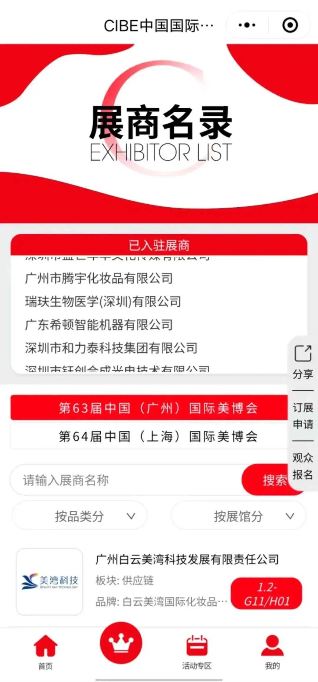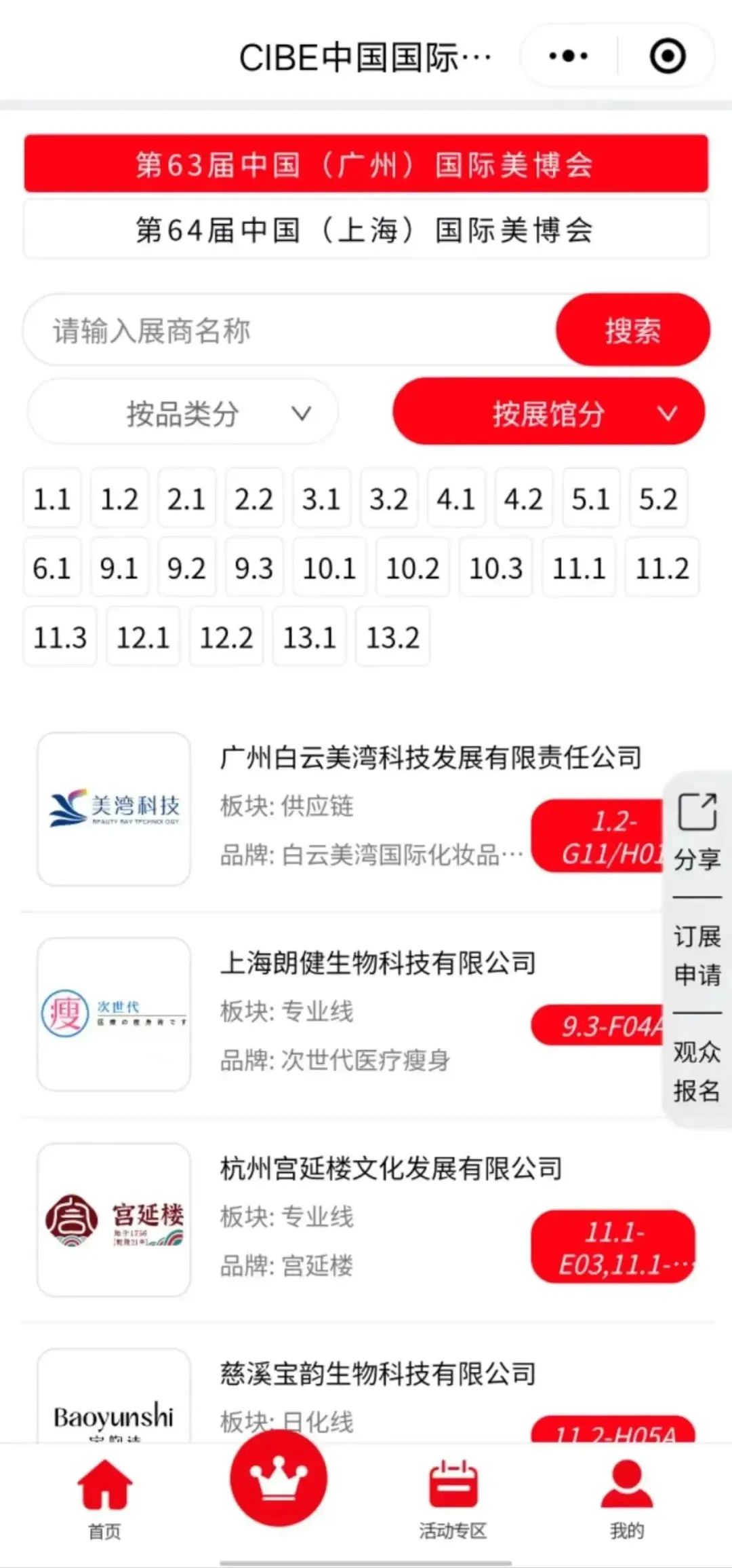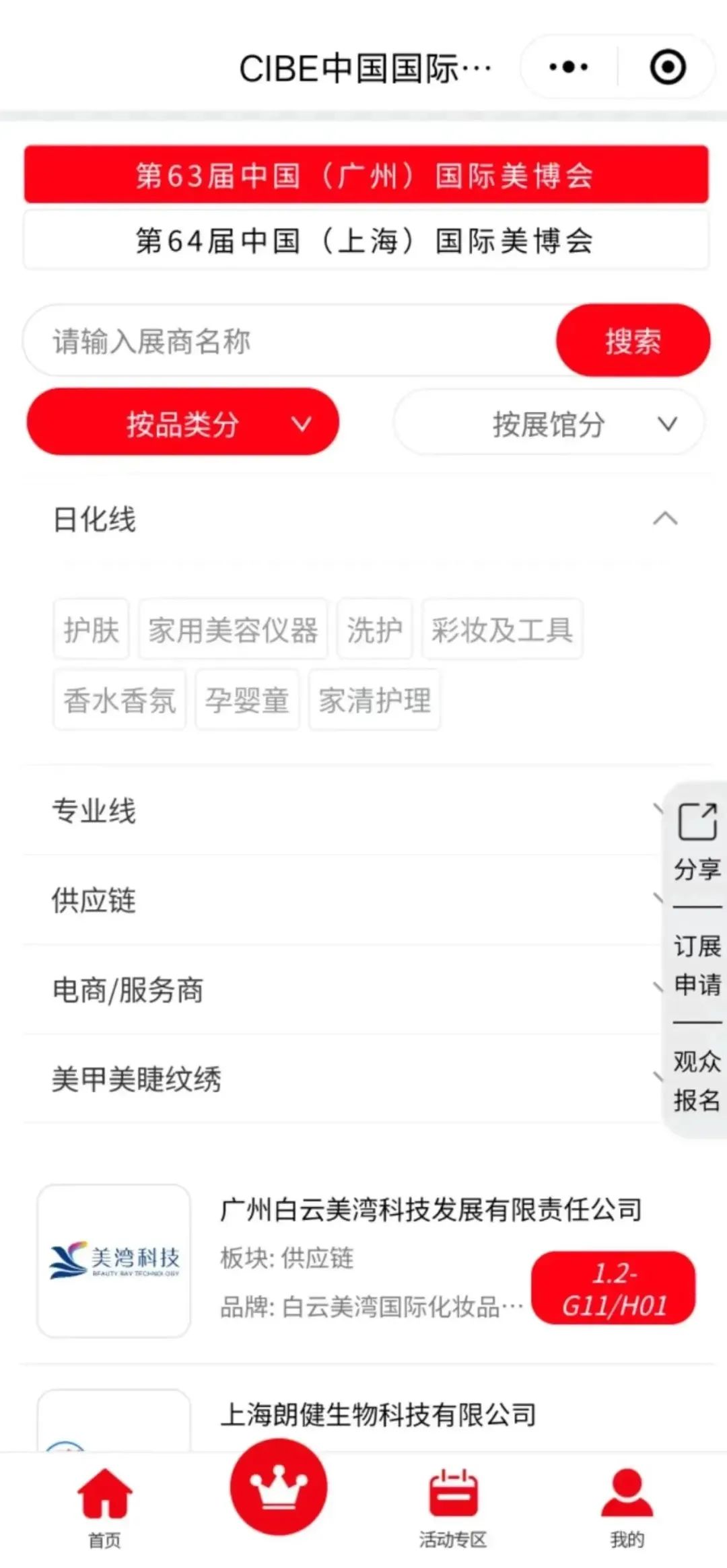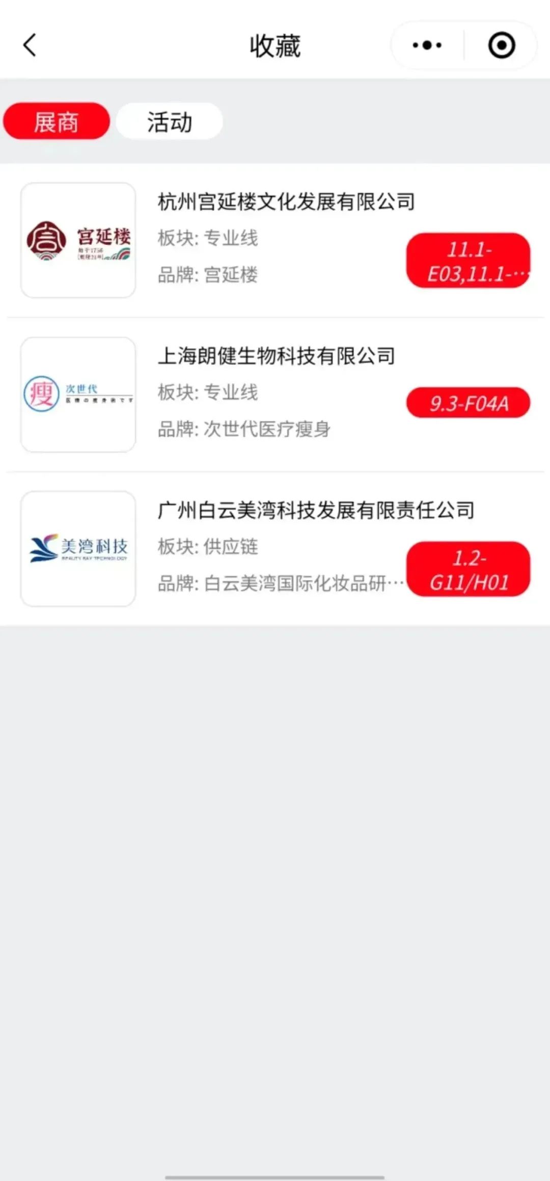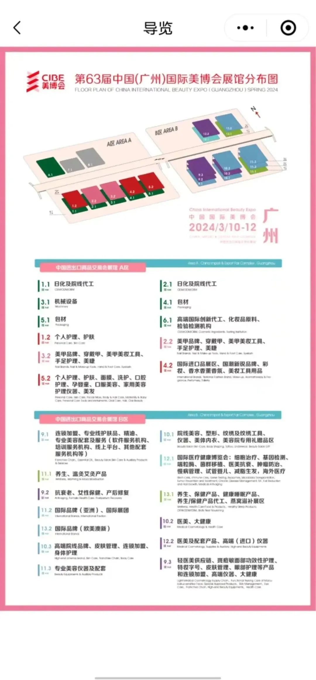 点击【我的】-【导览】,清晰了解3月广州美博会“展馆分布图”,帮你快速定位,节省找品时间,提高逛展效率。