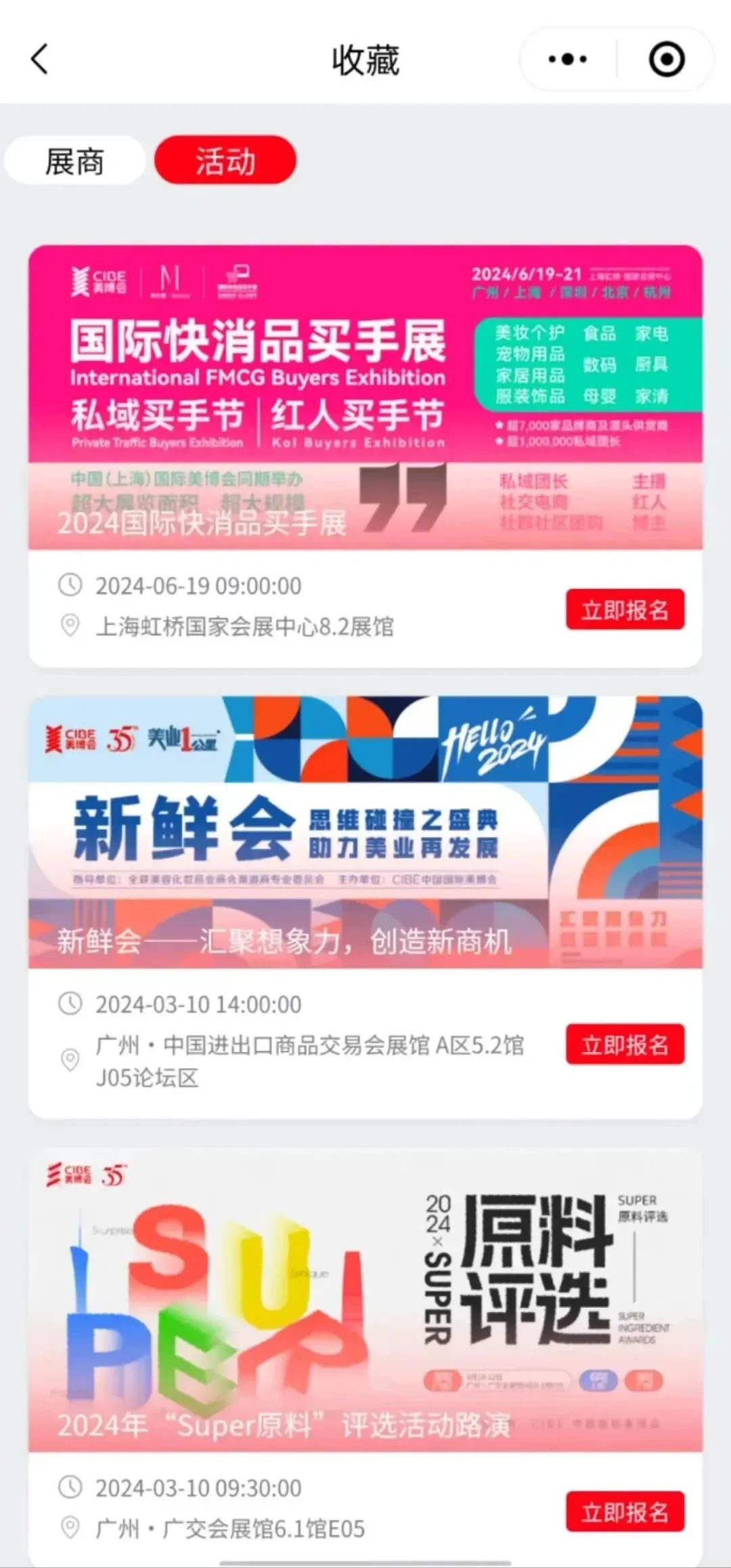 点击【我的】-【收藏】功能,可查看已收藏的“展商/活动”列表。展前做好意向展商列表、提前了解活动信息、抢占宝贵参会名额。