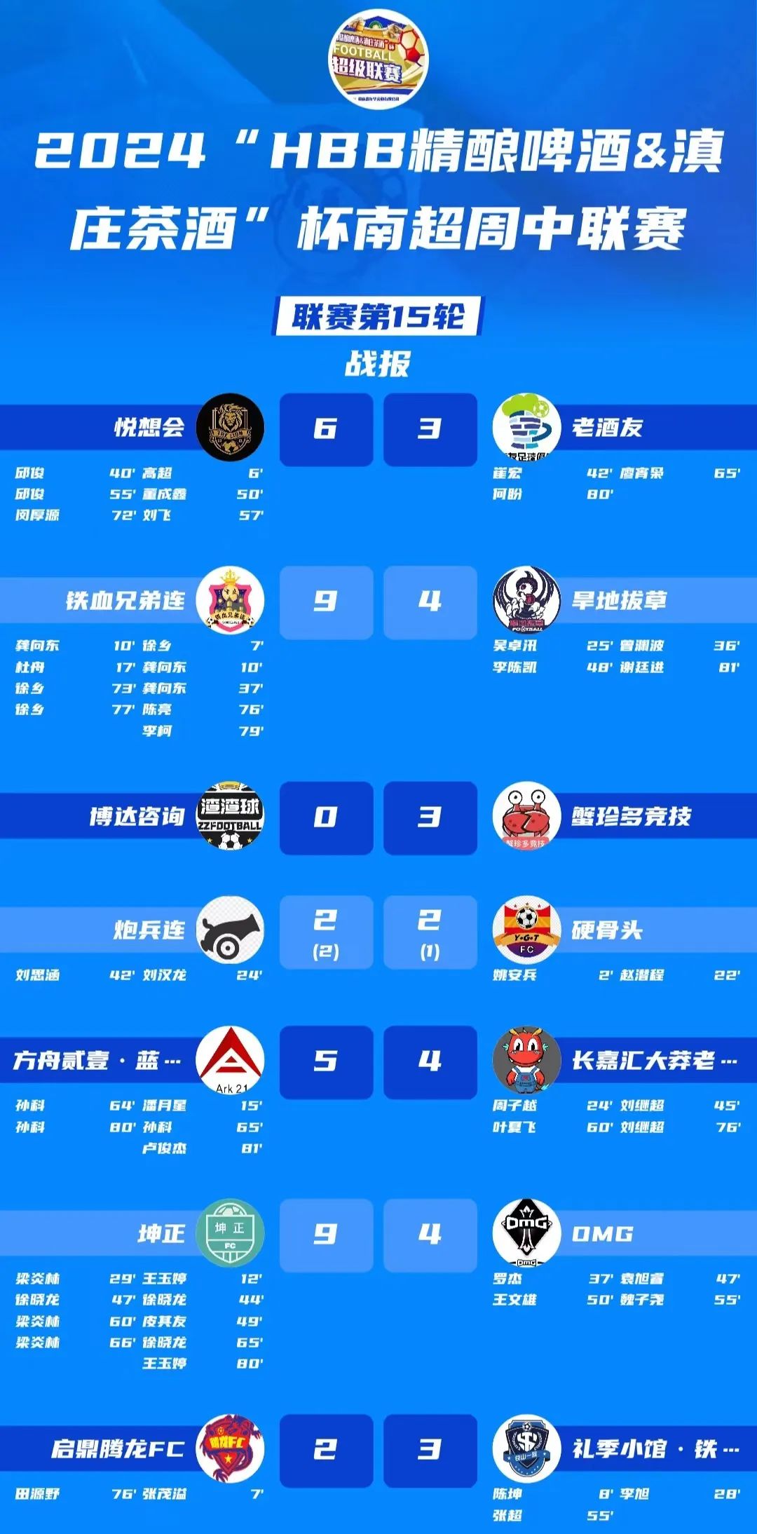 2024“HBB精酿啤酒&滇庄茶酒”杯南超周中超级联赛(第15轮)各项数据!